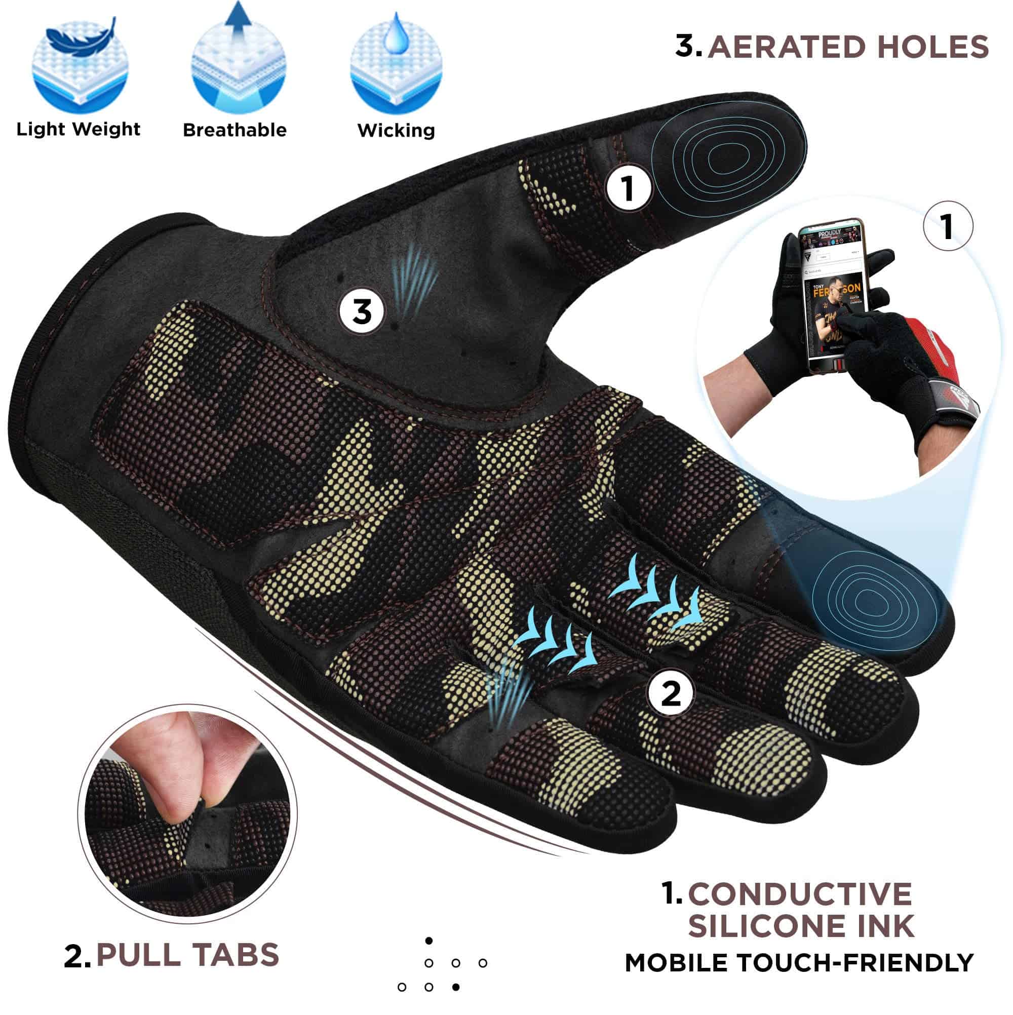 5. COMPATIBLE CON PANTALLA TÁCTIL Los guantes de levantamiento de pesas utilizan tinta de silicona conductiva en las puntas de los dedos del guante que permiten a los usuarios usar sus dispositivos inteligentes sin tener que quitarse los guantes.