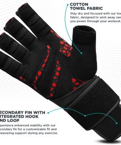 4. AJUSTABILIDAD MEJORADA El cierre rápido de gancho y lazo EZ en la correa extra larga de 50 CM de los guantes de entrenamiento y el cierre de gancho y lazo secundario que cubre el lado interno de la muñeca resultan en un guante de culturismo que es fácil de poner y rápido de quitar cuando sea necesario. La tela de toalla de algodón en la sección del pulgar facilita la absorción del sudor durante el entrenamiento.