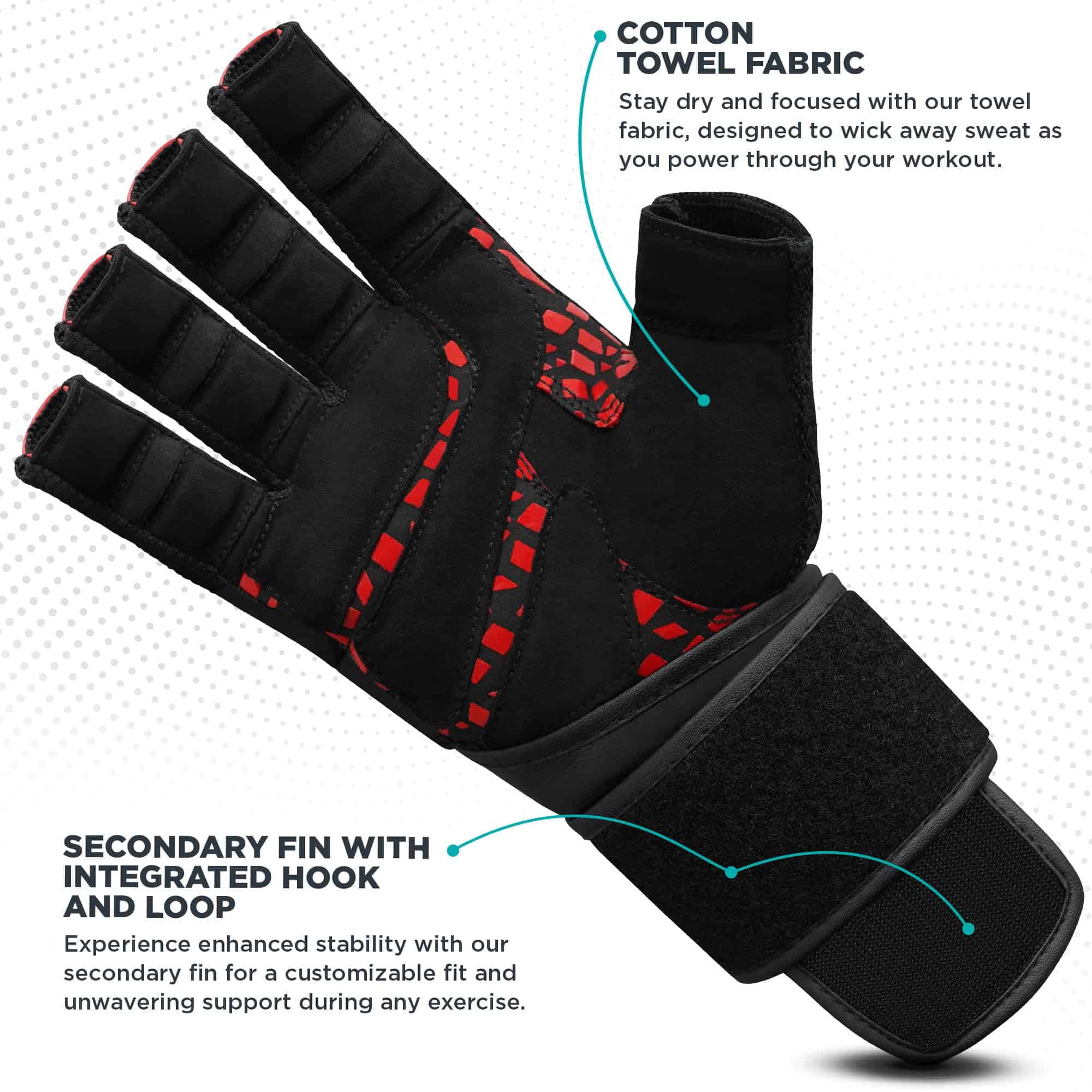 3. SOPORTE DE MUÑECA CAPA MULTIPLE Con tela elástica en el lado dorsal, una correa extra larga para soporte de muñeca y un sistema de cierre secundario con gancho y lazo en la muñeca para un ajuste adecuado, estos guantes de fitness aseguran que los usuarios rindan al máximo en y fuera del gimnasio.