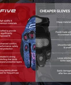 Comodidad y protección, estas son dos características principales que hacen que los guantes de moto FIVE Gloves Stunt EVO 2 Woman sean tan convincentes, así como una adición convincente a tus accesorios de moto y equipo de moto para mujeres. Este par de guantes de mujer para motociclistas son perfectamente adecuados para viajeros diarios que montan sus motos, scooters y más. Disponibles en variantes de rosa flor y negro, cada par de guantes de moto tiene 5 tallas: XS-07, S-08, M-09, L-10, XL-11. Stunt EVO 2 Woman es la oferta de FIVE Gloves para motociclistas que buscan comodidad y protección en sus guantes para mujeres. Utilizando conchas ergonómicas certificadas CE AirGO PROTECH, nuestros guantes de moto aseguran seguridad contra impactos por caídas. Estos guantes de moto y scooter están diseñados para cada mano, resistiendo el desgaste en la carretera. Las palmas de cuero de cabra de grano completo y las partes superiores de tejido de twill brindan suavidad. FIVE Gloves también agregó un Sistema de Pantalla Táctil para usar fácilmente tus gadgets para navegación y emergencias, haciendo que estos sean grandes guantes táctiles de moto también. Estas características aseguran la confiabilidad de Stunt EVO 2 Woman como guantes de motocicleta y guantes de moto para mujeres en diversas condiciones y niveles de dureza. FIVE Gloves, fabricantes de Stunt EVO 2 Woman, se comprometen a traer guantes de moto para mujeres de alta calidad con énfasis en protección, ajuste y diseño. Stunt EVO 2 Woman es el equipo perfecto para las damas que viajan por bulliciosas calles. Haz de nuestros productos tus regalos de moto perfectos para mujeres y más, y agrega nuestro Stunt EVO 2 Woman a tu amado equipo de moto y accesorios de moto para mujeres.