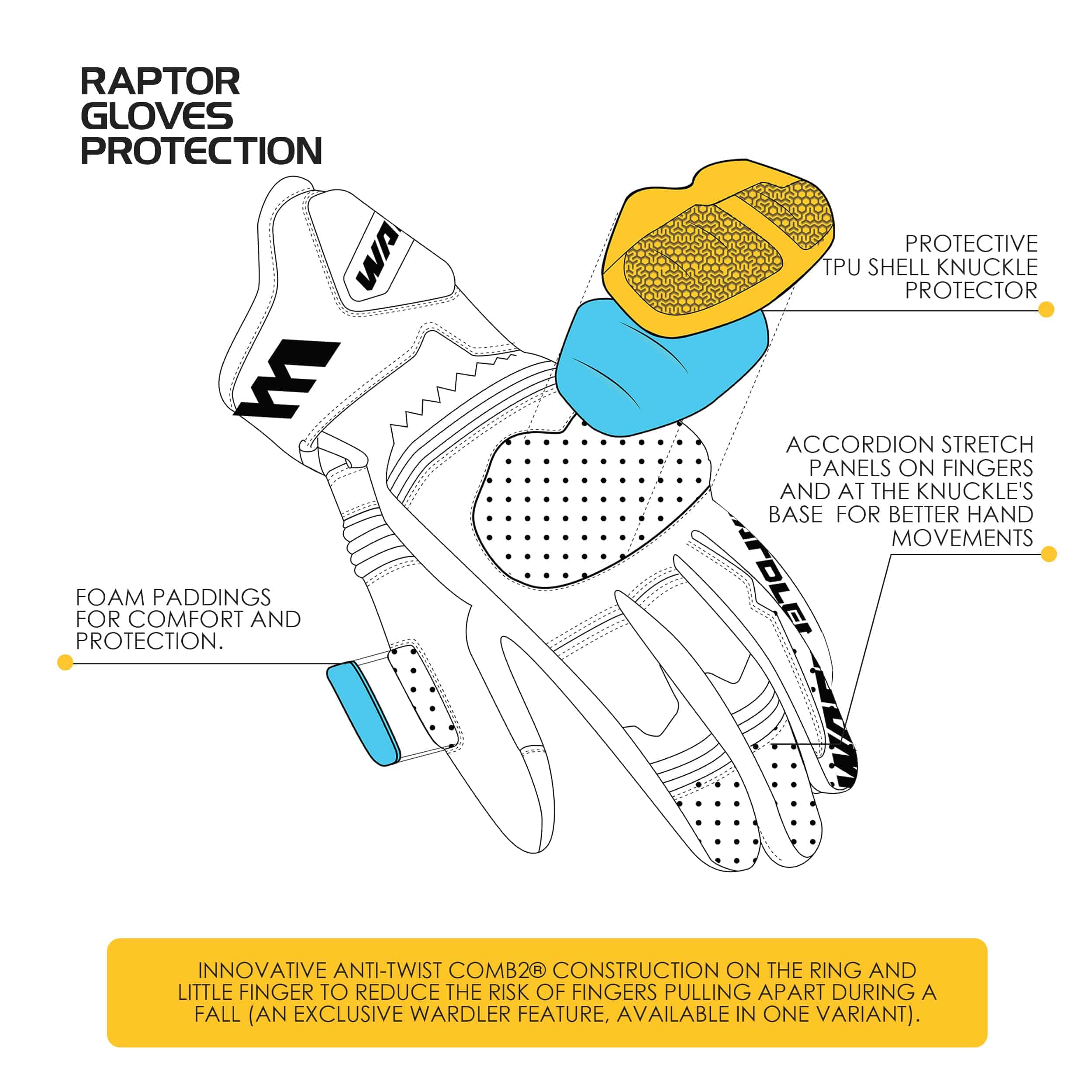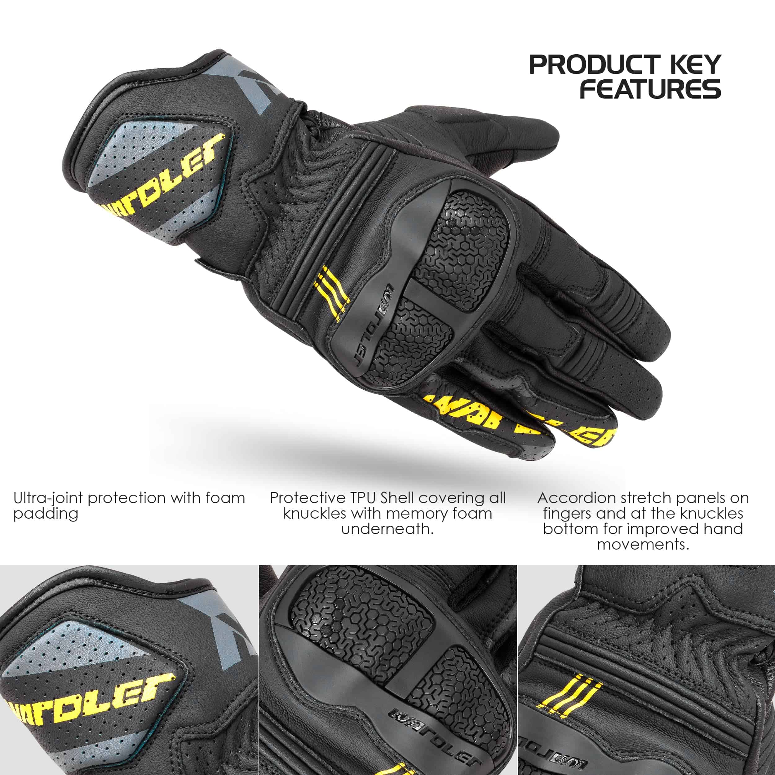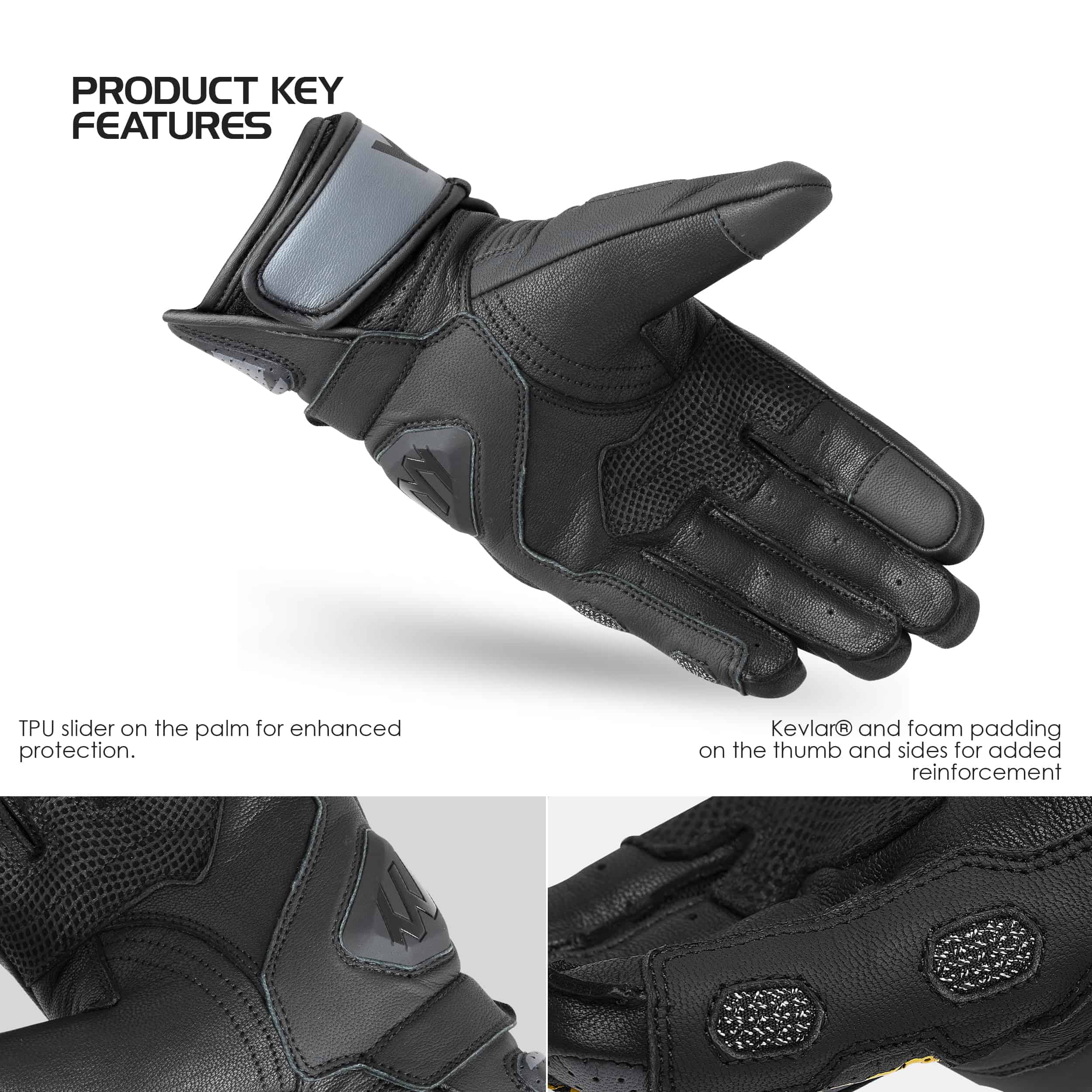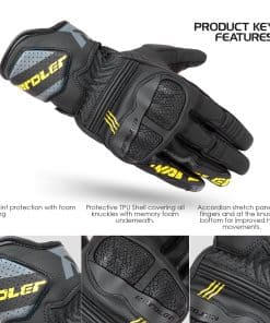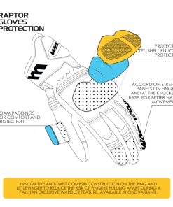 Guantes de Moto Raptor para Hombre con una construcción premium de cuero de primera calidad. La parte superior está hecha de resistente cuero de vaca y la palma está diseñada con suave piel de cabra Durashield para una mayor comodidad y durabilidad. Incluye características protectivas avanzadas como una carcasa protectora de TPU para los nudillos metacarpianos con acolchado interno de espuma y un deslizador de TPU en la palma para proteger contra impactos y abrasiones. La protección Ultra-Joint con acolchado de espuma garantiza una protección superior para los dedos y articulaciones durante actividades intensas o accidentes. El diseño innovador en los dedos anular y meñique minimiza el riesgo de separación de los dedos durante caídas. Los paneles elásticos acordeón en los dedos y la base de los nudillos mejoran la flexibilidad y los movimientos de la mano para un rendimiento óptimo. El sistema de cierre de correa rápida con cierre de gancho y lazo garantiza un ajuste seguro y personalizable para una comodidad durante todo el día. Las yemas táctiles permiten manejar dispositivos electrónicos fácilmente sin quitar los guantes. Cuenta con un diseño estilizado y deportivo con una combinación de colores moderna que complementa cualquier outfit, haciéndolo perfecto tanto para rendimiento como para estilo.