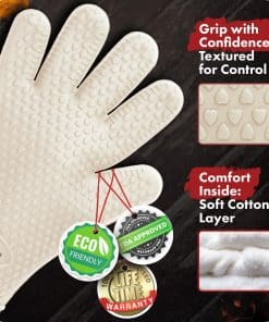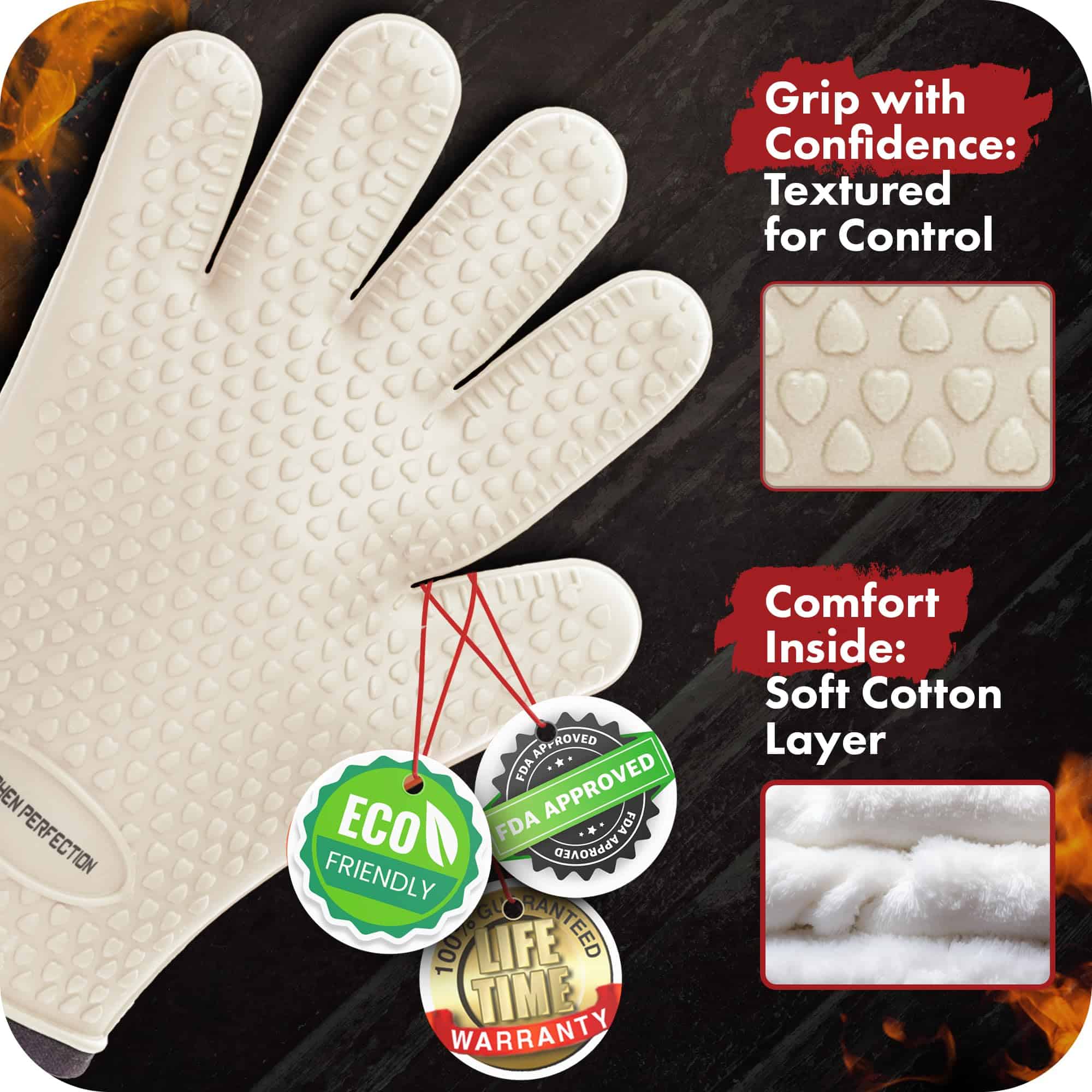 4. De Kitchen Perfection – Si sientes que no obtuviste el mejor producto, no dudes en contactarnos, estamos aquí para ti en caso de cualquier problema, problemas de tamaño y más. Estos son los mejores guantes de barbacoa para cocinar resistente al calor para mitones protectores de hombres y mujeres. ¡Por eso a todos les gustan tanto! Será mejor que obtengas algunos para regalar a tus amigos.