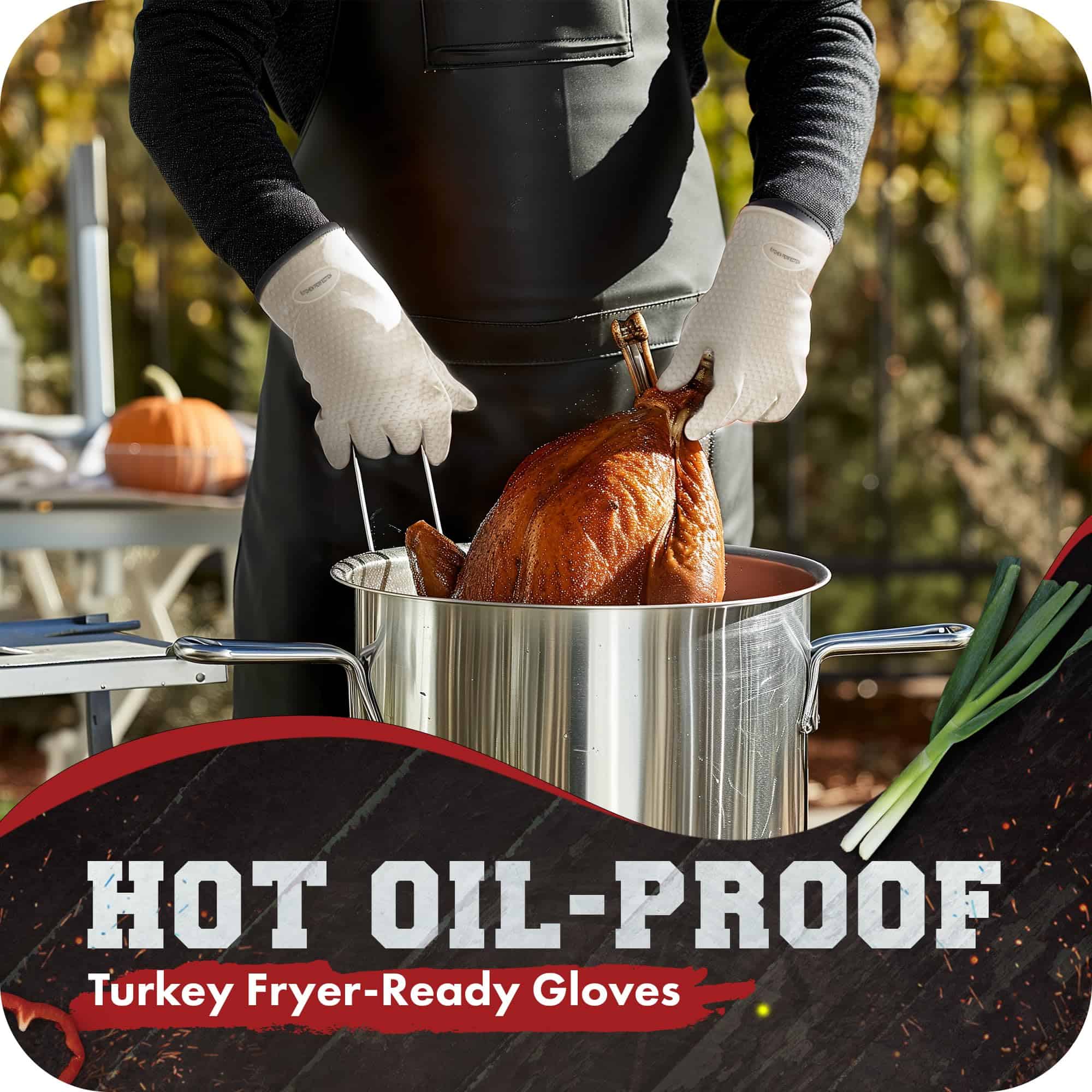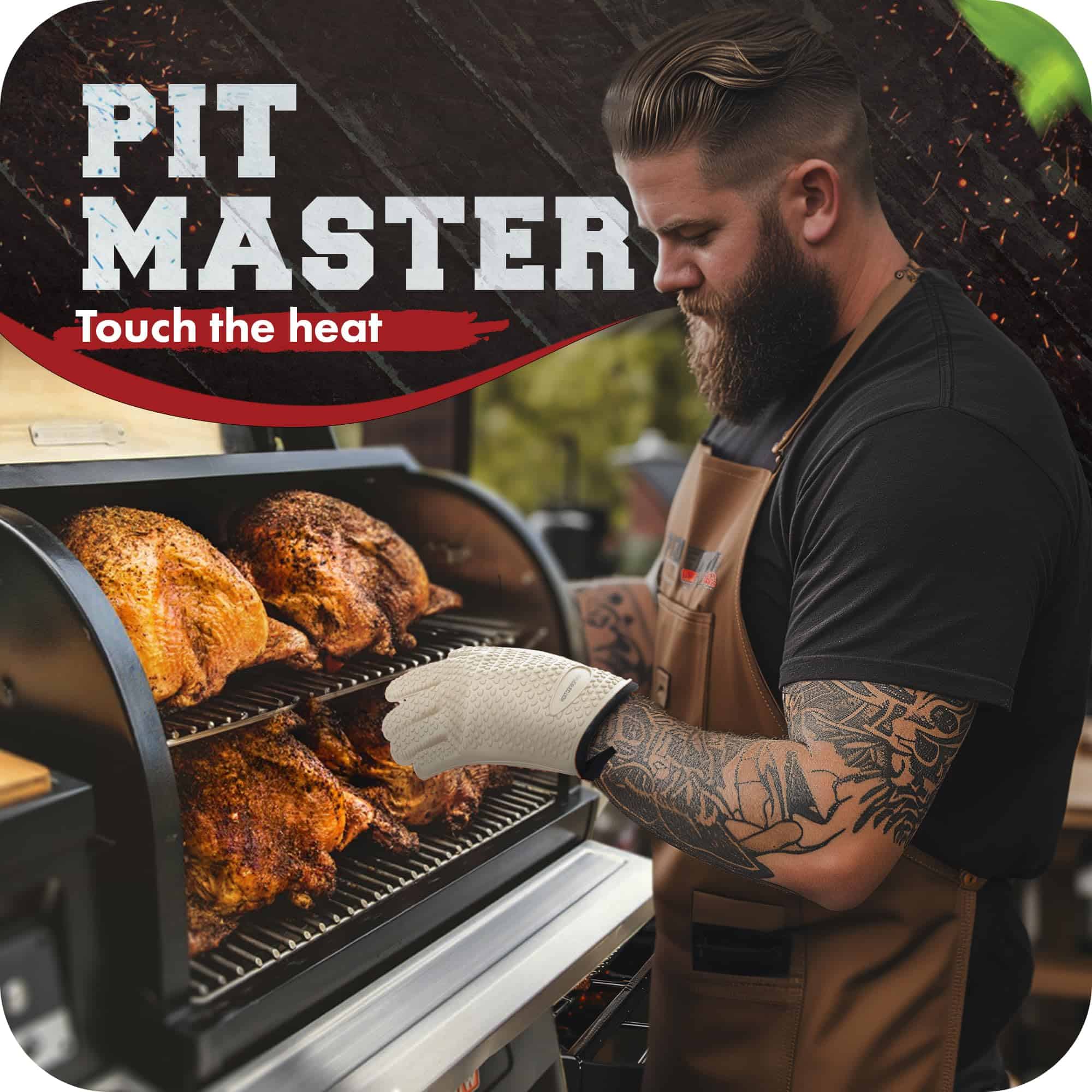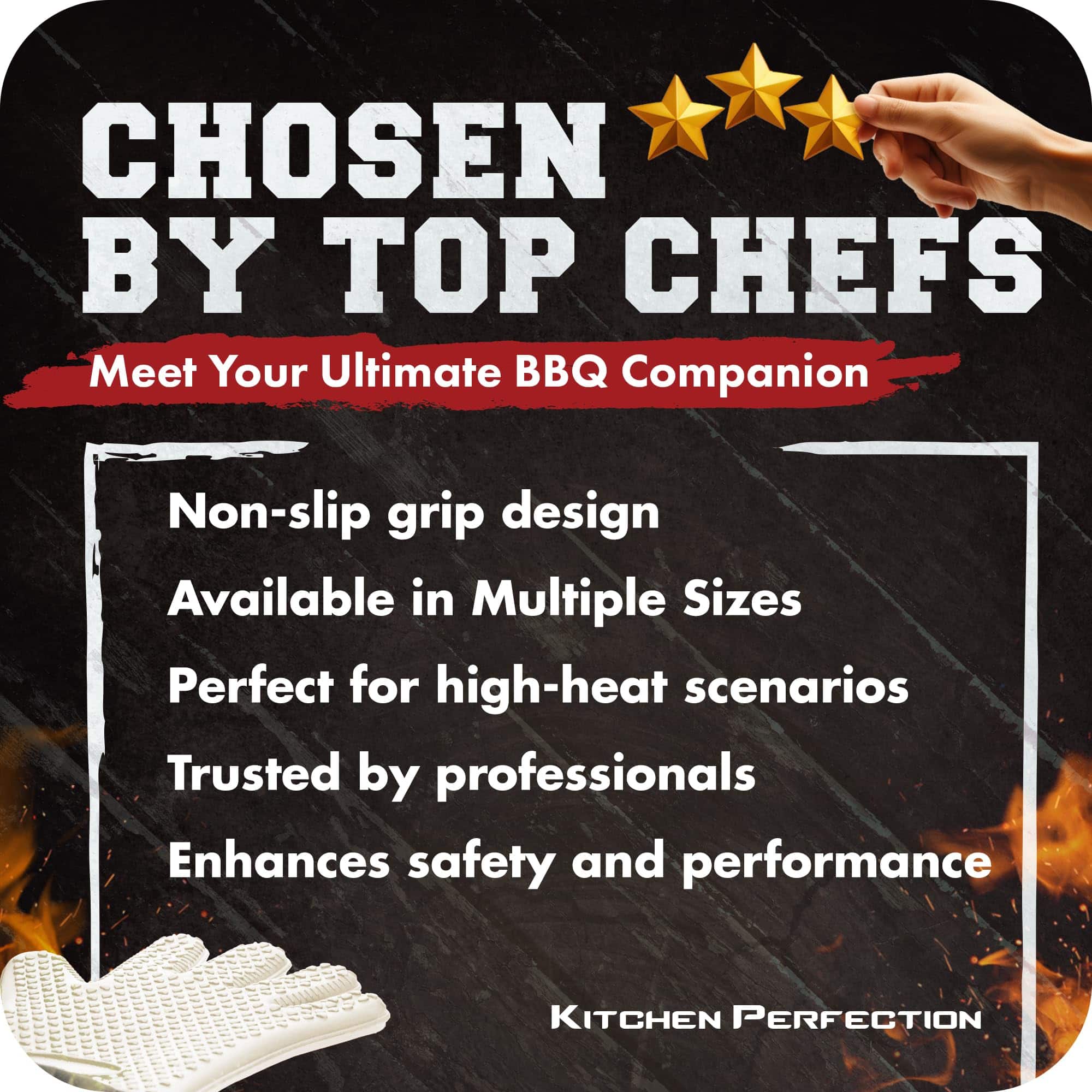 1. Los Guantes Definitivos Para Amantes de las Barbacoas No te quemes, para tu protección utiliza los guantes de parrilla de 11 pulgadas de Kitchen Perfection, de alta calidad, duraderos hasta 500 grados, doble capa de algodón grueso y silicona impermeable, guantes de aislamiento excepcionales que se ajustan a manos grandes y pequeñas por igual, úsalos para tu traeger, big green egg, freidora de pavo, ahumador oklahoma joe, camp chef, weber, rec tec, black stone, carbón, pit boss, parrillas de gas pesadas y ahumadores.