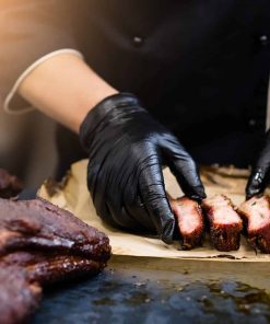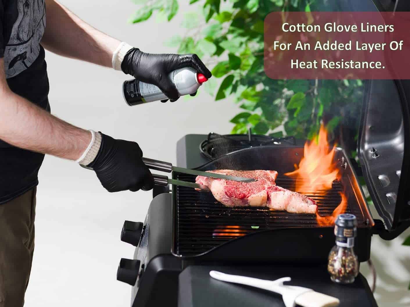 5. Combine el forro de algodón con los guantes desechables – Nuestros forros de algodón y guantes negros para barbacoa están diseñados para trabajar juntos. Coloque estos guantes negros desechables sobre sus forros de algodón para manejar de forma segura carnes calientes y utensilios de cocina.