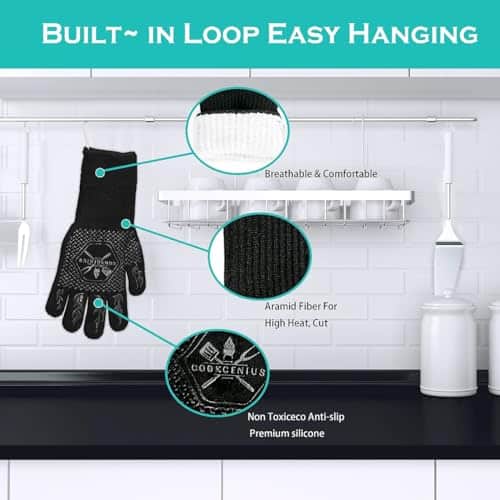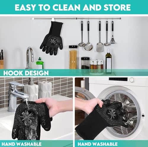 2. FÁCIL DE LIMPIAR Y ALMACENAR: Es fácil limpiar nuestros guantes resistentes al calor lavándolos a mano o en máquina. El interior tiene un práctico lazo para colgar y secar, lo que hace que almacenar sea sencillo. Los guantes BBQ se adaptan tanto a la mano derecha como a la izquierda por igual y no difieren de ninguna manera.