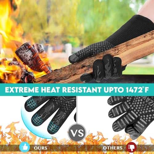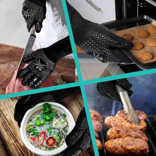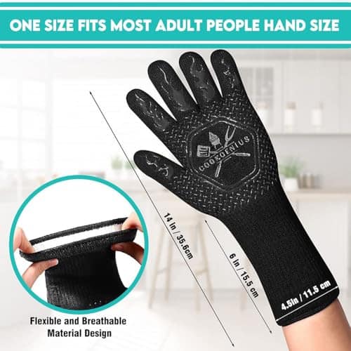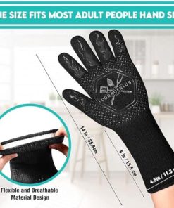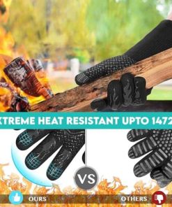 1. RESISTENTE AL CALOR: Nuestros guantes BBQ están diseñados para proteger tus manos cuando estás horneando, asando a la parrilla, cocinando o trabajando con ollas calientes. Perfectos para hornear y freír a altas temperaturas, estos guantes tienen una resistencia al calor inmediata de hasta 1472 F. Nuestros mitones para barbacoa ofrecen la mejor protección posible para las manos siendo flexibles y cómodos. La tela de alta calidad disipa eficientemente el calor, proporcionando a tus manos una excelente protección al manejar objetos calientes que implican calor.