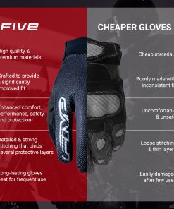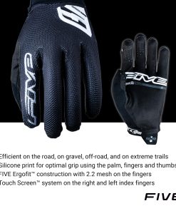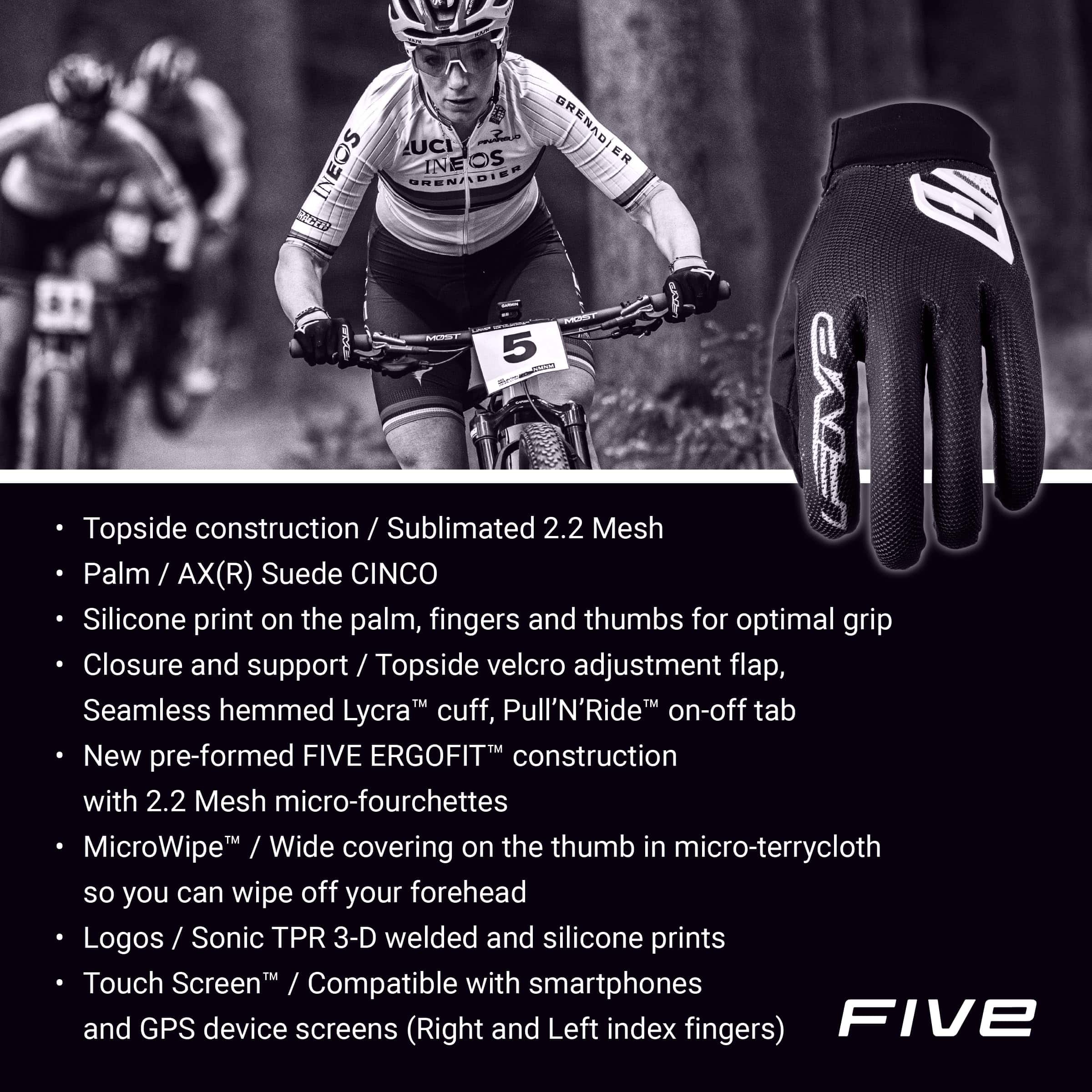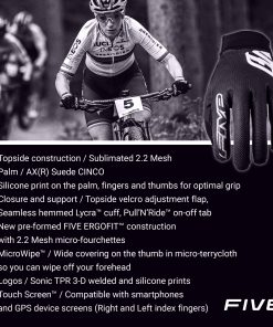 5. Haz la elección correcta en guantes de ciclismo – Desde hace casi 20 años, FIVE Gloves ha estado ayudando a los ciclistas a mejorar su disfrute en el manillar mientras protege las manos de lesiones en caso de una caída, equipando a miles de entusiastas del ciclismo global como los Campeones Mundiales XC Tom Piddock y Pauline Ferrand Prevot. Nuestro compromiso puede resumirse en tres palabras: Protección, Ajuste y Diseño, con comodidad, nivel de protección y durabilidad en mente. Agrega nuestros guantes a tu querido equipo de ciclista.