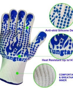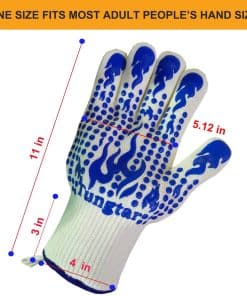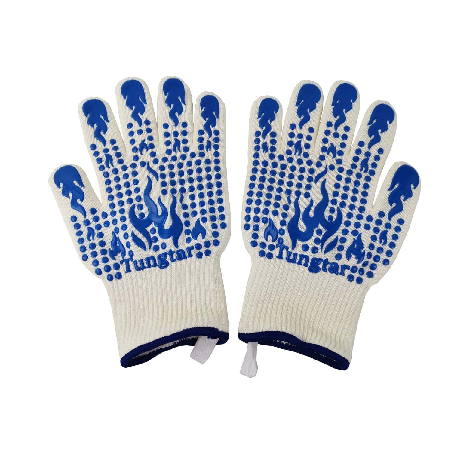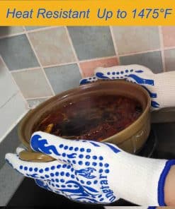Guantes para horno resistentes al calor BBQ 11 pulgadas 1472? Guantes a prueba de parrilla Guante a prueba de calor para mujeres hombres Juego de regalo de guantes de cocina para cocinar, asar a la parrilla, hornear, soldar (Blanco Azul) – 1. Guantes para horno extremadamente resistentes al calor a prueba de calor BBQ certificados EN407 están hechos de tela de aramida (igual que Nomex y Kevlar) con recubrimiento de silicona que pueden soportar hasta 1472 y son excelentes para horno, ahumador, asados a la parrilla, cocción, corte, horneado, asar a la parrilla y manipular artículos calientes con los guantes resistentes al calor en interiores o exteriores. 2. Guante de horno antideslizante de silicona caliente Los guantes para horno equipados con silicona de grado alimenticio pueden garantizar que sus objetos no se resbalen fácilmente de sus manos. Además, los 5 dedos separados pueden transportar fácilmente todo tipo de sartén o cuenco caliente cuando esté cocinando y eso es seguro y estable, etc. 3. Guantes de parrilla de barbacoa de primera calidad extienden la protección de la muñeca que mantiene sus manos, muñecas y antebrazos más seguros. Mientras tanto, los guantes para horno han estado utilizando el material de más alta calidad para que puedan proteger sus manos en condiciones de alta temperatura. 4. Fácil de limpiar Es fácil de limpiar, lavable a máquina con un gancho práctico para colgar, los guantes de barbacoa con diseño de gancho son fáciles de guardar en cualquier lugar. 5. OCASIONES DE USO Los guantes para cocinar a prueba de calor que hicimos se pueden usar para barbacoas en casa y al aire libre, cocinar y hornear, freír pavos, hornos, parrillas y diversas ocasiones donde necesite proteger su mano y antebrazo del escaldado.