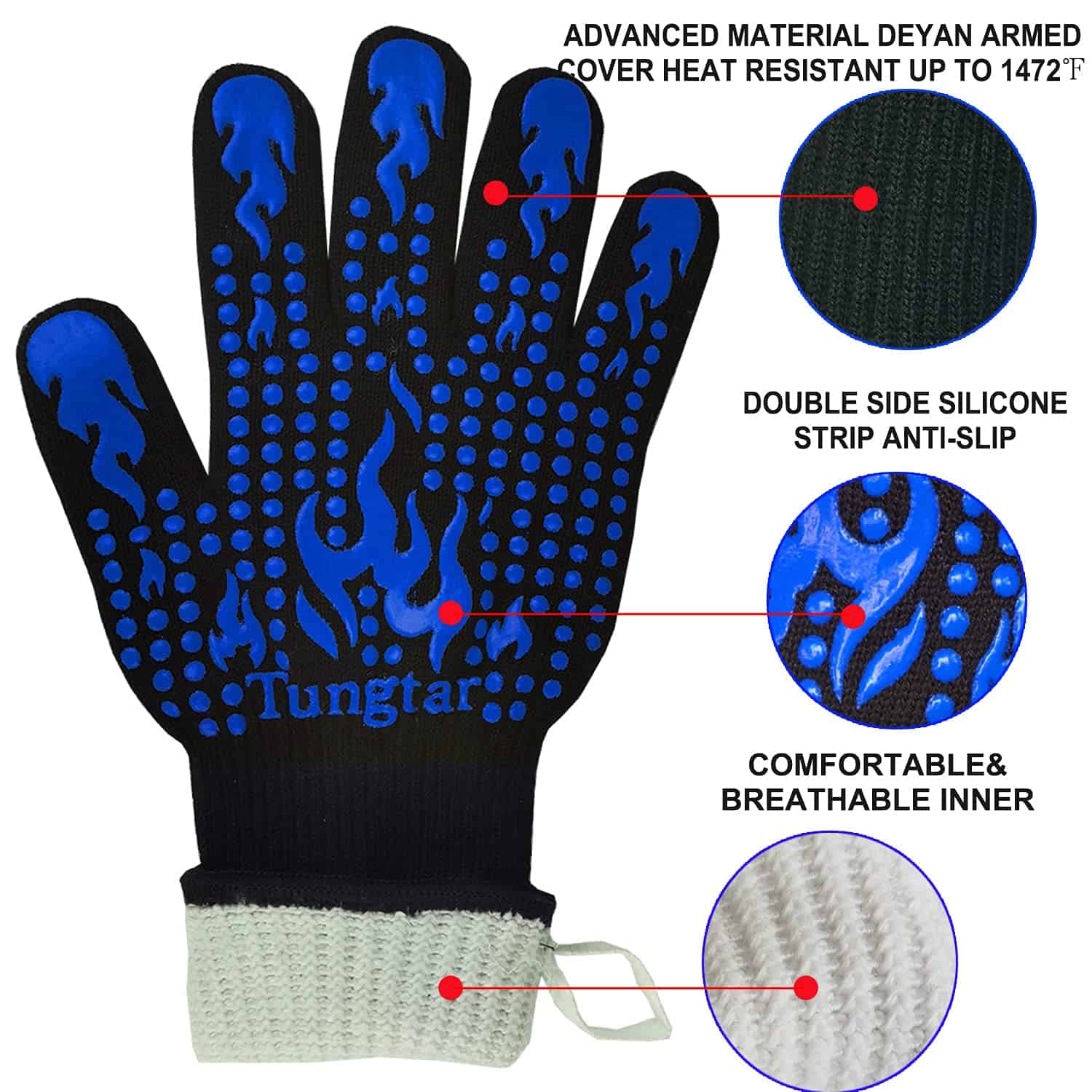 Los guantes para horno resistentes al calor BBQ Heat Proof Gloves 1472? son ideales para cualquier entusiasta de la parrilla o cocina. Están fabricados con tela de aramida con revestimiento de silicona que puede soportar temperaturas de hasta 1472 H, lo que los hace perfectos para usar en BBQ, cocinar, cortar, hornear, asar a la parrilla o manipular artículos calientes. Además, cuentan con palma antideslizante y cinco dedos separados que garantizan un agarre firme y seguro al manipular objetos calientes. La protección extendida de la muñeca brinda una mayor seguridad a tus manos, muñecas y antebrazos, mientras que el material transpirable evita que tus manos suden en condiciones de alta temperatura. Además, son fáciles de limpiar, simplemente lavándolos con un poco de jabón y colgándolos para que se sequen. Estos guantes son perfectos para uso en interiores y exteriores, como barbacoas, cocinar, hornear, freír pavos, entre muchas otras ocasiones donde necesites proteger tus manos y antebrazos del calor.