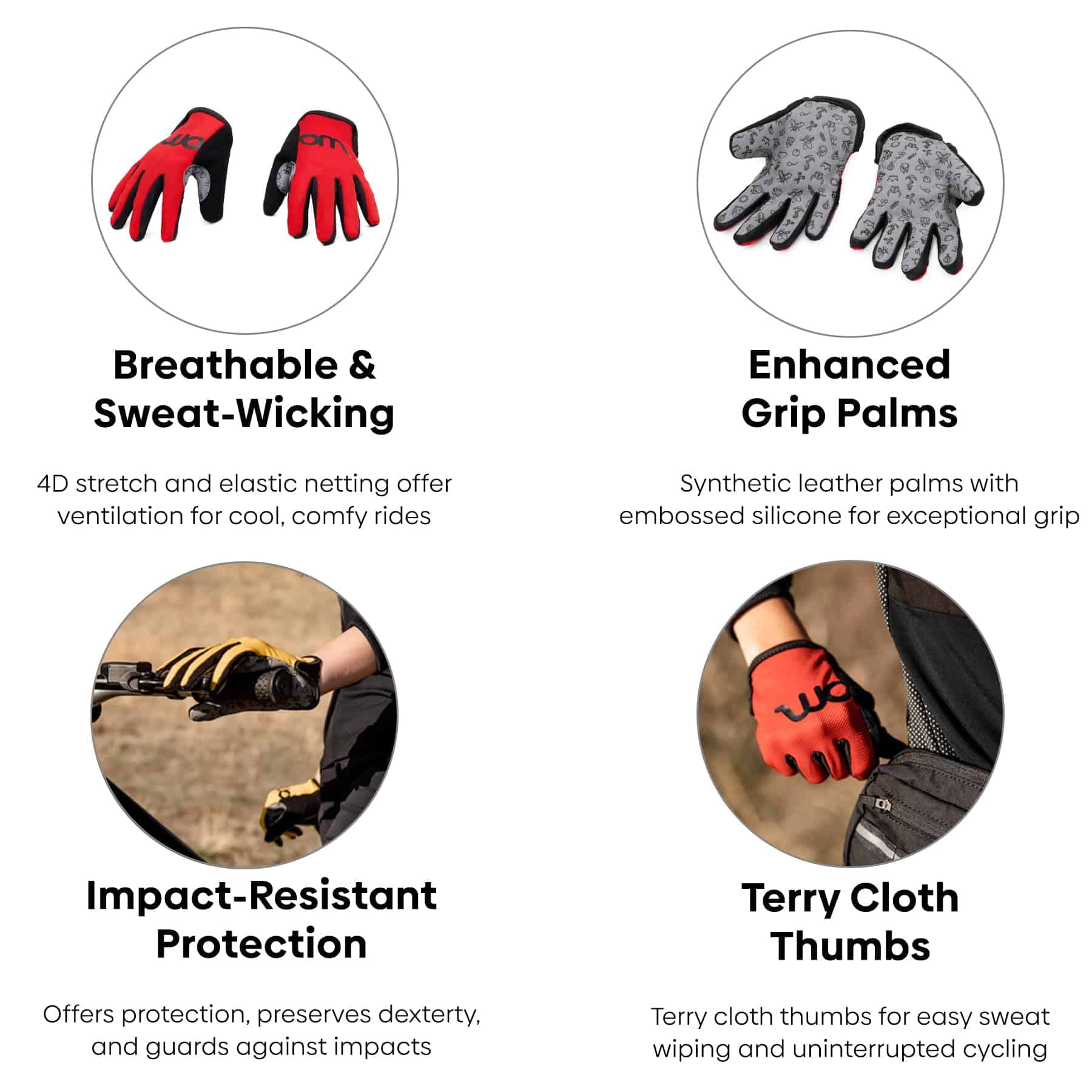 Guantes de dedos completos para niños: nuestros guantes no solo lucen geniales y a la moda, sino que también son una característica de seguridad adicional para nuestros jóvenes ciclistas. Usar guantes mejora el agarre de las manos y ofrece una conexión más estrecha con el manillar.