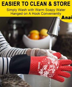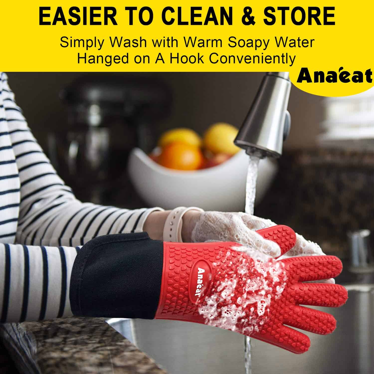 4. FÁCIL DE LIMPIAR: A diferencia de otros guantes de tela o algodón, nuestros guantes de silicona para horno son súper fáciles de limpiar, la silicona hace que sea muy fácil mantenerlos limpios, ¡solo necesitas lavarlos con agua jabonosa tibia y secarlos con un paño de cocina! Los Guantes de Barbacoa Anaeat lucen como nuevos después de pasar por el lavavajillas.