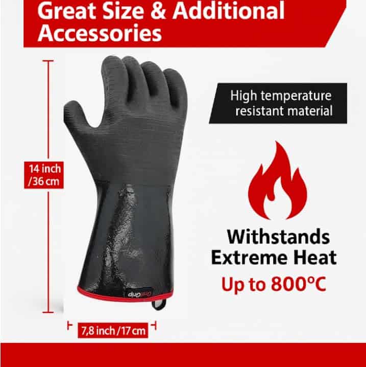 1. Resistentes al calor hasta 932 F Diseñados para parrilladas intensas, ahumados y freír en profundidad. Protege las manos de llamas abiertas, aceite caliente y calor extremo durante largas sesiones de BBQ o cocinar a la parrilla.