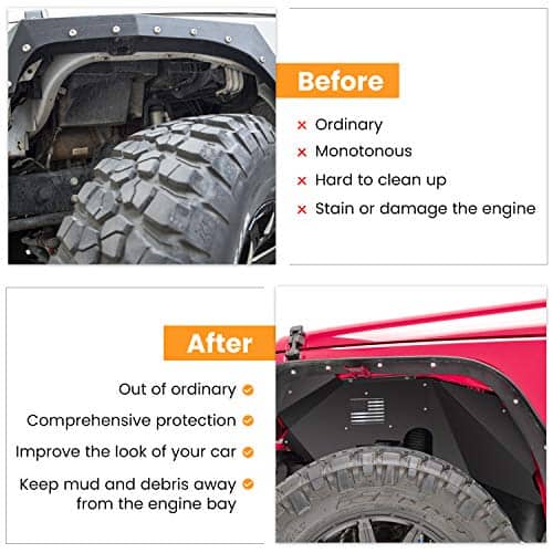 Perfectamente adecuado para Jeep Wrangler JK JKU 2 puertas y 4 puertas del 2007 al 2018. Diseño de ajuste de datos de vehículos originales de alta precisión, fabricado según las especificaciones OEM, se ajusta con precisión a los bordes y hace que tu coche sea único. Material superior de aluminio ligero, durabilidad, resistencia al impacto, anticorrosión y resistente al óxido. Fácil de instalar y limpiar, diseño dividido que facilita la instalación y retirada. Mejora la apariencia de tu coche y proporciona un estilo decorativo de alta gama y único. El guardabarros interior llamativo ayuda a mantener el polvo, barro y escombros lejos del compartimento del motor y en una forma más aerodinámica. Garantía de satisfacción del 100%, si no estás 100% satisfecho con nuestros guardabarros, simplemente devuélvelo para obtener un reembolso completo en 30 días. Soporte de garantía de 12 meses. ¡Servicio profesional y sincero que te permite comprar en E-cowlboy sin riesgos!