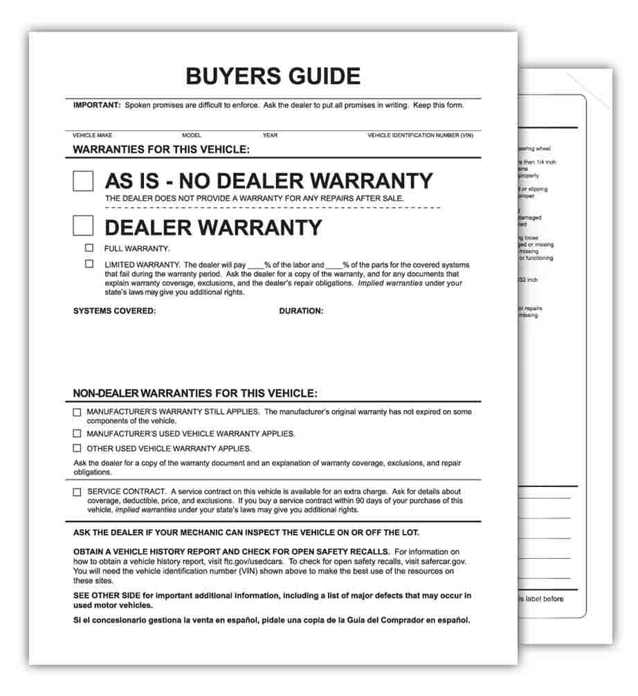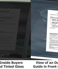 Las Guías del comprador exteriores están diseñadas para adherirse al exterior de la ventana del automóvil. Las Guías del comprador en el interior de las ventanas del vehículo pueden ser difíciles de ver detrás del vidrio tintado, y el adhesivo puede dañar el tintado de la ventana postventa. Las Guías del comprador exteriores son fáciles de leer para los clientes y no dañarán el tintado de la ventana. El tamaño es de 8.5 x 11 pulgadas. Empaquetadas 100 por paquete. Nota de impresión: Todos los materiales sintéticos, este artículo incluido, requieren que la impresora láser reduzca la temperatura del fusor para evitar daños en el material. Las impresoras logran esto de muchas maneras diferentes, pero a menudo seleccionar etiquetas como tipo de papel obligará a la impresora a funcionar de manera más fresca. La temperatura recomendada del fusor es inferior a 250 grados Fahrenheit. Algunas impresoras más antiguas o modelos económicos no pueden reducir la temperatura del fusor. Consulte con el fabricante de su impresora antes de imprimir en cualquier material sintético.