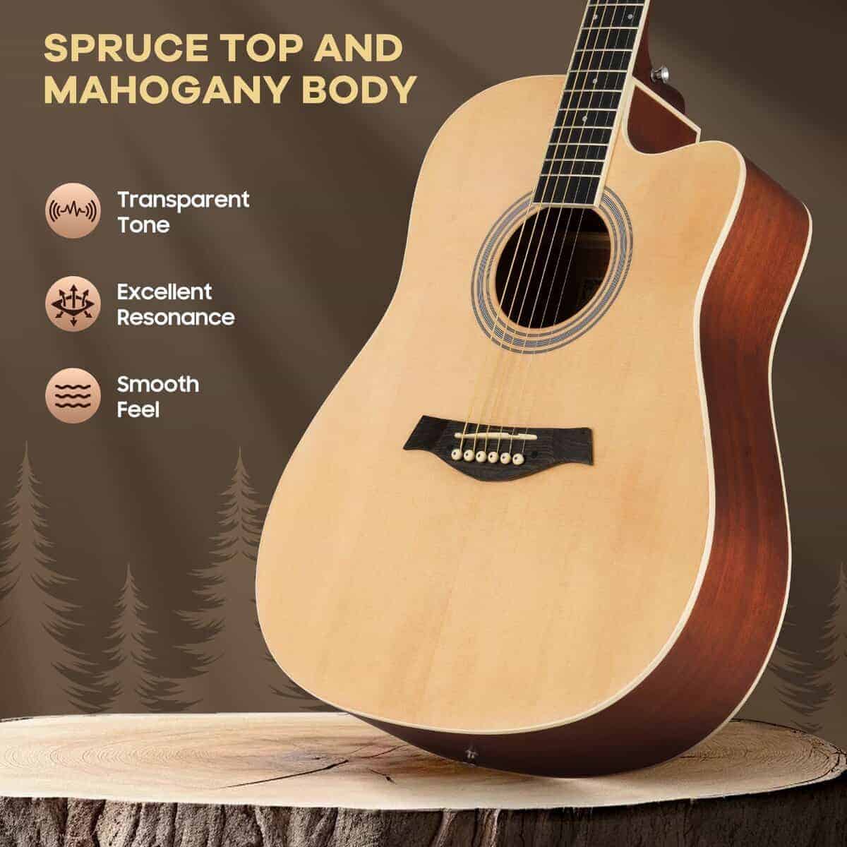 Presenta una tapa sólida de abeto y una parte trasera y laterales de caoba, combinando un patrón de refuerzo tradicional «X» para producir un tono claro y brillante con una resonancia profunda. Ya sea tocando un ritmo ligero o rasgueando acordes, la guitarra ofrece un sonido completo y rico, lo que la hace ideal para una variedad de estilos acústicos.
