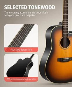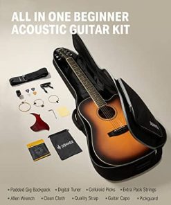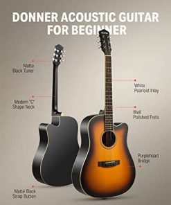 Esta guitarra acústica Donner DAG-1CS diestra con cutaway sunburst incluye todos los accesorios que necesitas para empezar a tocar directamente desde la caja. El paquete incluye la guitarra acústica DAG-1CS diestra con cutaway, un maletín de calidad, capo para guitarra, afinador DT-2, cuerdas de guitarra, correa de guitarra, púas de guitarra y paño de pulido. ¡Ahorra tiempo y dinero con un paquete de guitarra acústica todo en uno! El DAG-1CS cuenta con una tapa de abeto con refuerzo en forma de scalloped bracing, cuerpo y laterales de caoba, clavijas de afinación cromadas, cuerdas de un buen calibre y un protector de púa de PVC. Las clavijas de afinación están hechas de acero para facilitar la afinación y mantener la cuerda afinada en posición. No solo tiene todo lo que necesitas para aprender y tocar la guitarra acústica, sino que también tiene un precio tan asequible que no requiere una gran inversión para empezar. La guitarra ofrece un sonido cálido y vibrante en tus manos a un precio excelente con una opción de características convenientes y prácticas que harán que el guitarrista principiante en tu casa esté tocando en poco tiempo. ¡Coge la guitarra y únete al creciente fanfarria de la guitarra! ¡Disfruta de tu propia vida divertida y colorida. Especificaciones Color: Sunburst Tamaño: Tamaño completo 41 pulgadas cutaway Orientación de la mano: Diestros Forma del cuerpo: Dreadnought Espalda y laterales: Caoba africana AAA Tapa del cuerpo: Abeto africano AAA Material del cuello: Caoba africana AAA Forma del cuello: Forma «C» Incrustaciones de posición: Puntos de incrustaciones Roseta: Anillos concéntricos Número de trastes: 20 Máquinas de afinación: Fundición de acero Paquete incluido: 1 x Guitarra acústica DAG-1CS 1 x Bolsa grande 1 x Correa de guitarra 1 x Capo de guitarra 1 x Cuerdas de guitarra 1 x Afinador Donner DT-2 1 x Paño de pulido 4 x Púas de guitarra