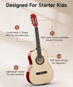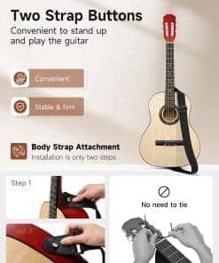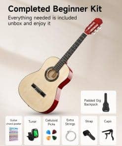 1. Ideal para Principiantes Pequeños: Guitarra acústica Moukey 36″ equipada con cuerdas de nylon suaves que son más fáciles de pulsar, no causan dolor en los dedos y reducen el daño en el puente de la guitarra. Viene con un póster de acordes para un aprendizaje sencillo, adecuado para niños, adolescentes y adultos.