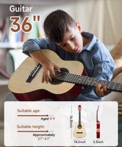 4. Adecuado para Adolescentes y Adultos: Tamaño del producto: 14.2(L) 3.3(W) 36.8(H) pulgadas. La guitarra acústica Moukey 36″ es adecuada para adultos y jóvenes de 5-9 años o más / altura de 3’7 – 4’7 o más. La guitarra pequeña de 36 pulgadas es portátil para viajes, conciertos o clases. Su acabado impecable y su construcción compacta la convierten en una excelente elección para jóvenes aprendices.
