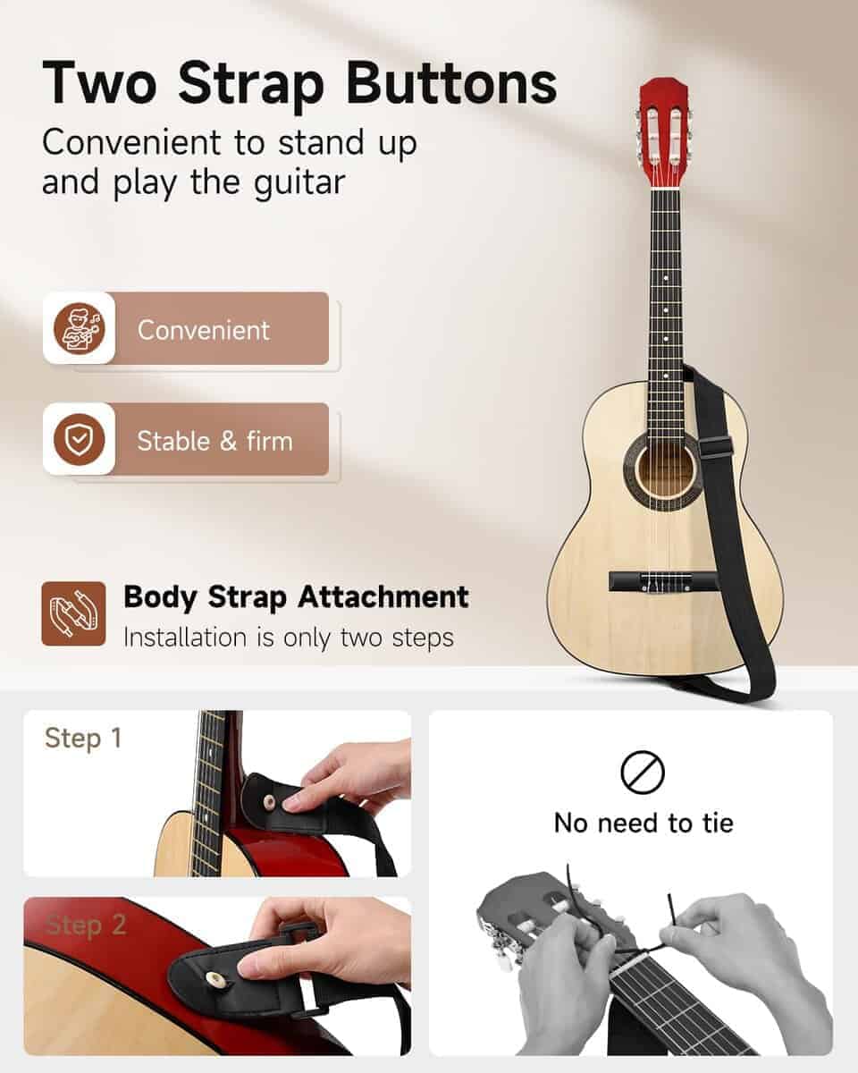 2. Calidad Artesanal: Cuerpo de calidad en madera de tilo, mástil de okoume, diapasón suave y trastes no rayadores que permiten tocar la guitarra acústica cómodamente durante mucho tiempo. 2 clavijas de correa te permiten sujetar la correa fácilmente.