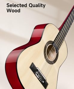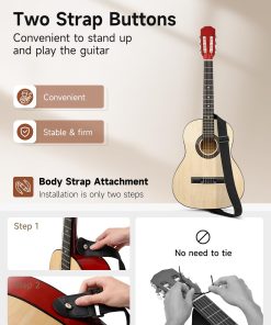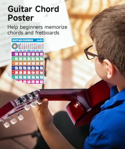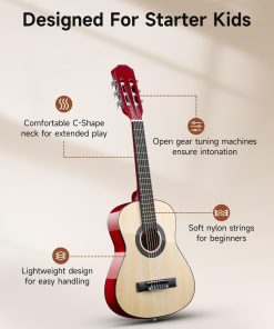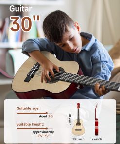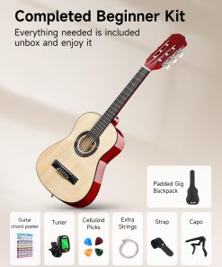 Guitarra acústica Moukey de 30″ ideal para principiantes pequeños. Cuerpo de madera de calidad, mástil de okoume, diapasón suave y trastes que no rayan permiten tocar la guitarra cómodamente durante mucho tiempo. Cuerpo Dreadnought proporciona un tono completo y vibrante, ideal para todo tipo de música. 6 clavijas de afinación te permiten mantener la guitarra afinada por mucho tiempo. Tamaño del producto: 10.8(L) 2.6(A) 30.7(AL) pulgadas. Adecuada para niños de 3-5 años o más/altura 2�5 -3�7 o más. Incluye todo lo necesario para principiantes: guitarra acústica Moukey de 30″, póster de acordes, estuche acolchado de 3 mm, afinador, correa, capo, cuerdas y púas. Un regalo decente para tus hijos, querido, amigos y familia.