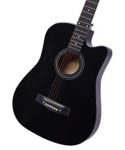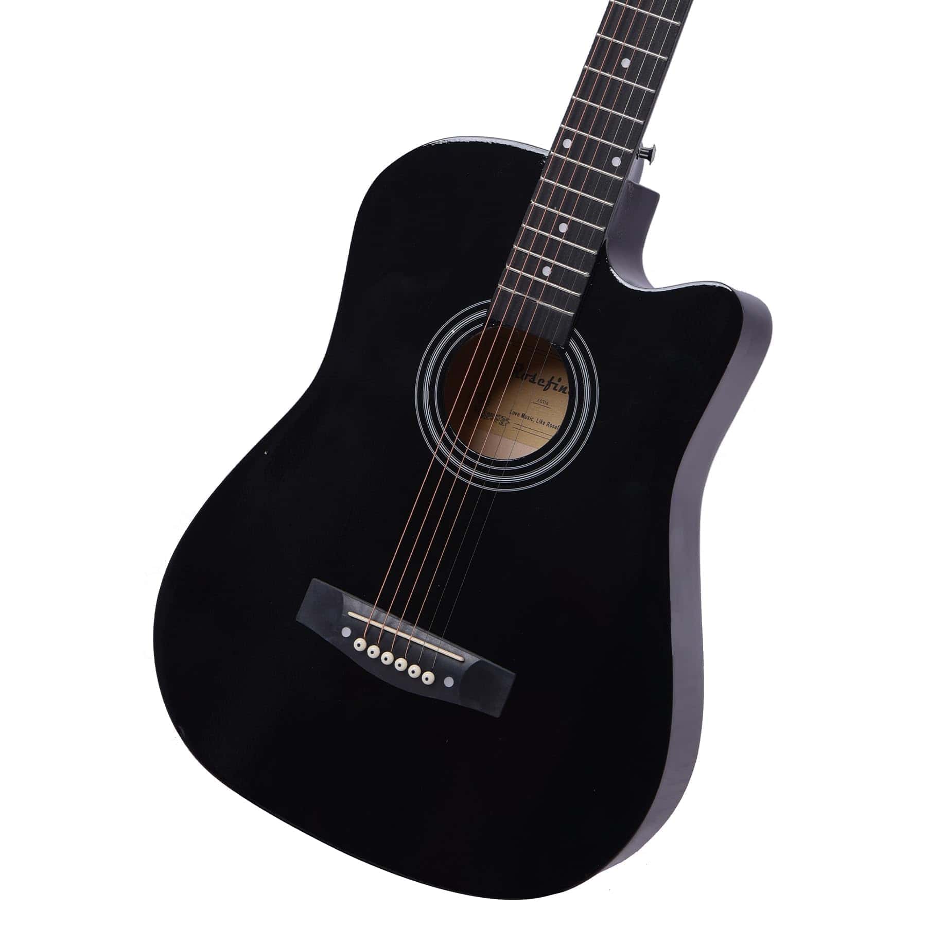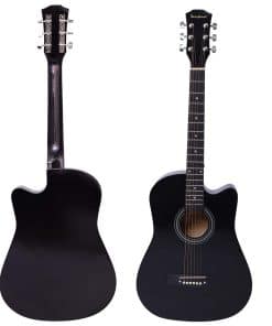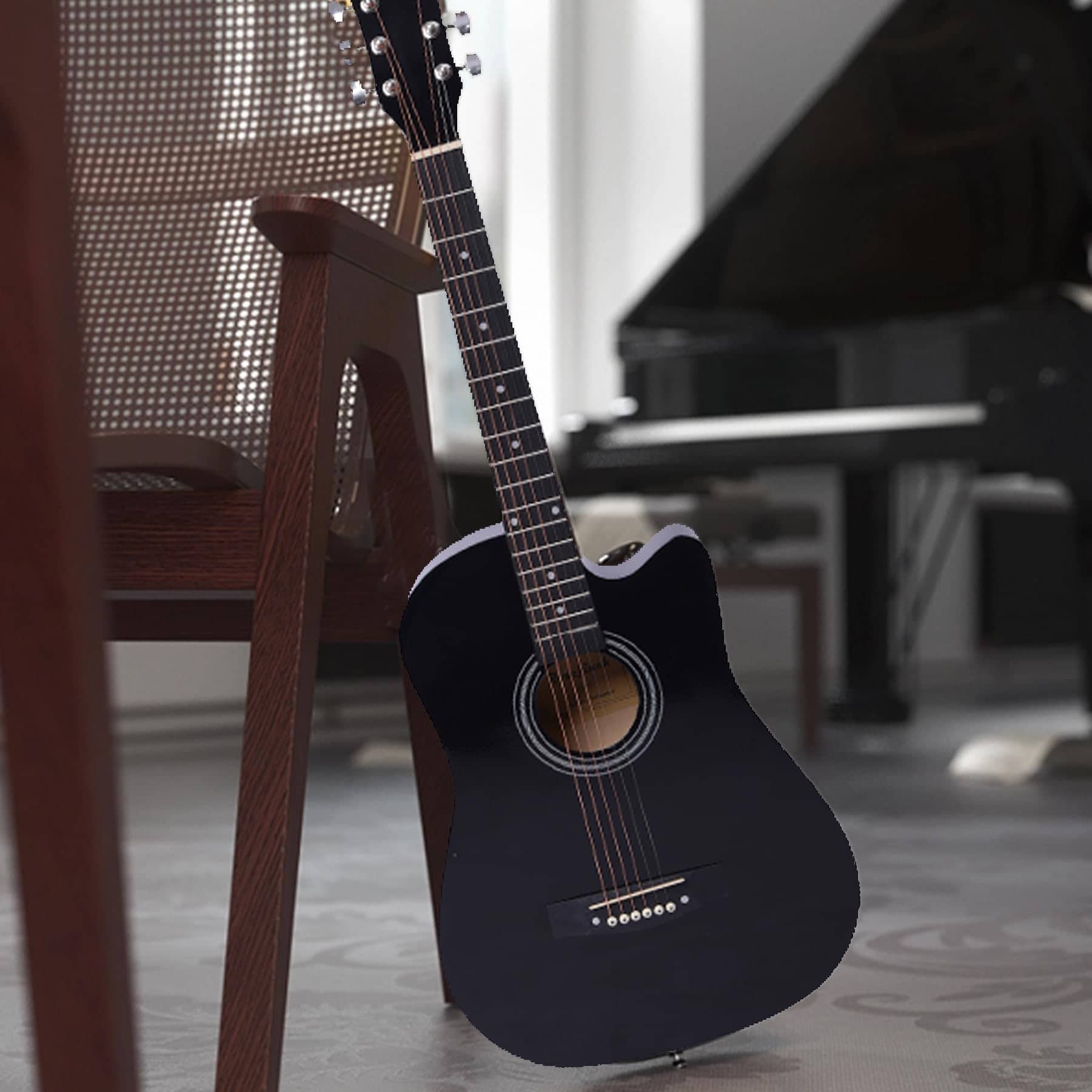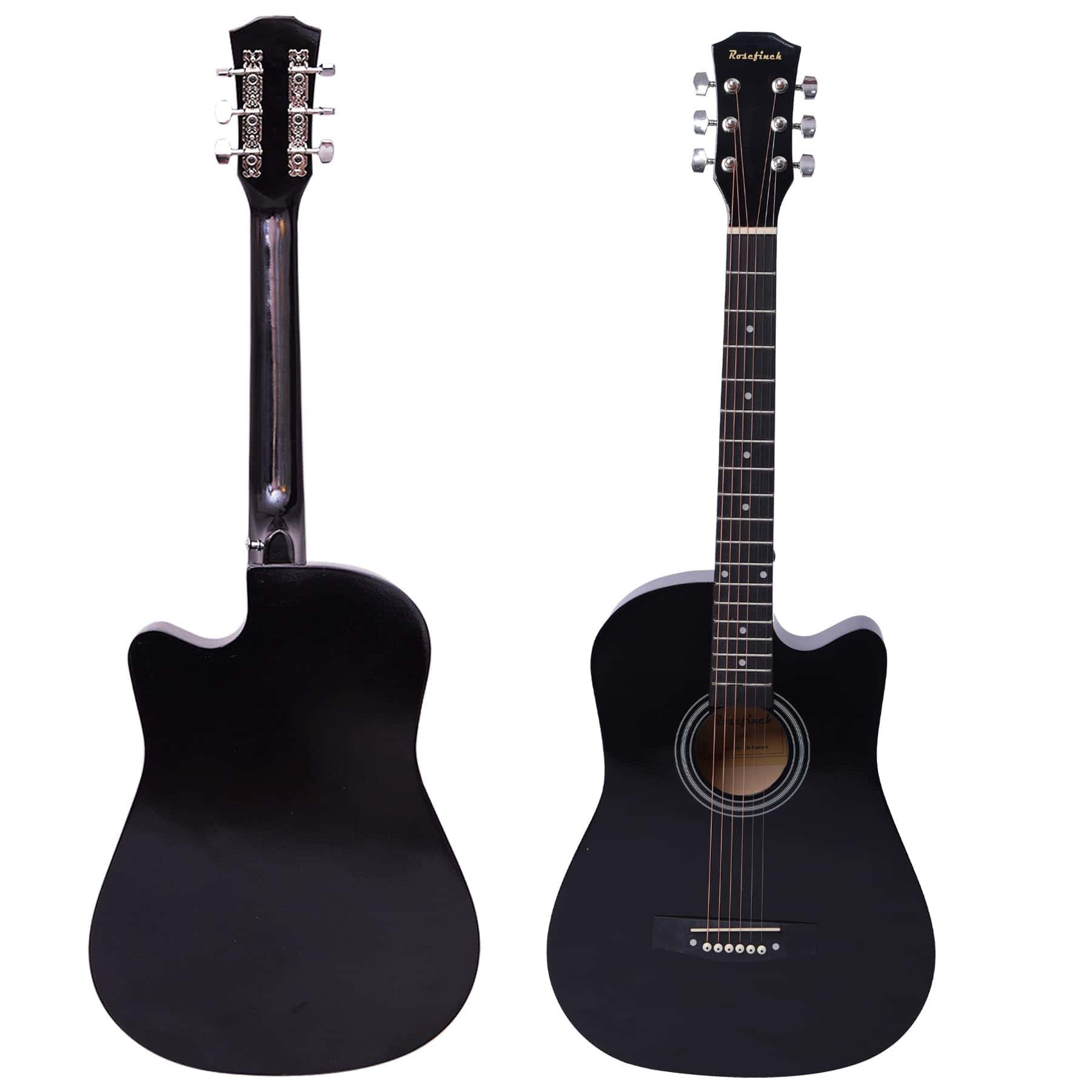 1. Adecuado para principiantes – Como guitarra acústica diseñada para principiantes, es fácil de usar y tocar. Será una gran elección para personas que no quieren afinar las cuerdas una y otra vez como en el ukelele. Puedes tocarla en muchos lugares, como clases de guitarra, recitales, ensayos de banda, actuaciones en el escenario y mucho más. 2. Cuerdas de alta calidad – Esta guitarra acústica incluye 6 cuerdas. Estas cuerdas de guitarra están hechas de acero de alta calidad, que tiene una buena calidad de sonido y una afinación estable. Las personas pueden crear un sonido rico al pulsar las cuerdas suavemente. Casi todas las guitarras se desafinarán al principio porque la ‘nueva cuerda’ está un poco apretada. Se estirará y funcionará bien después de un par de veces, todo lo que necesitas hacer es tocar y afinarla siempre. 3. Superficie de alto brillo – Los paneles trasero y lateral están hechos de madera de tilo de alta calidad. La estructura de madera de esta guitarra te proporcionará un sonido más brillante y cómodo. La guitarra acústica tiene una pintura pulida en la superficie, que es brillante y se ve noble. La superficie lisa y plana te brinda una sensación de disfrute. 4. Paquete incluido – Rosefinch se dedica a hacer que los principiantes puedan disfrutar de un aprendizaje sencillo. Esta guitarra acústica de 38 pulgadas viene con una bolsa de nailon duradera, una correa, un capo, afinador para principiantes, un paño para guitarra, 3 púas, y un juego de cuerdas de metal, un protector, un enrollador de cuerdas y 4 protectores de dedos. 5. Siempre estamos aquí – Muchas gracias por venir. Si tienes algún problema (como entrega retrasada, productos dañados durante el transporte, accesorios faltantes, etc.), no dudes en contactarme y te ayudaré a resolver el problema lo más rápido posible. Sinceramente Rosefinch