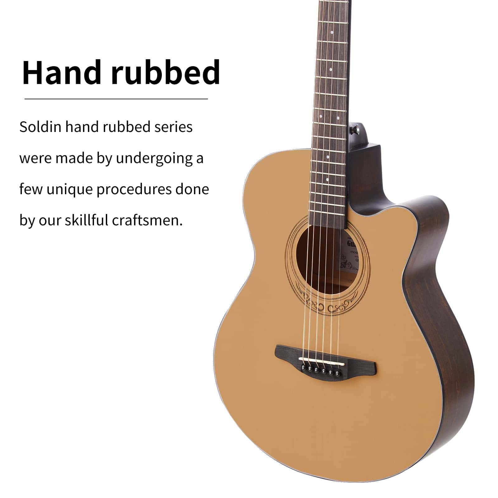 3. FROTADO A MANO – Las series frotadas a mano de Soldin fueron hechas pasando por algunos procedimientos únicos realizados por nuestros hábiles artesanos. La madera que utilizamos para las guitarras frotadas a mano es elegida individualmente por el patrón natural. Luego requiere artesanos hábiles para pulir y frotar a mano, dándoles a estas guitarras un aspecto que las distingue de otras.
