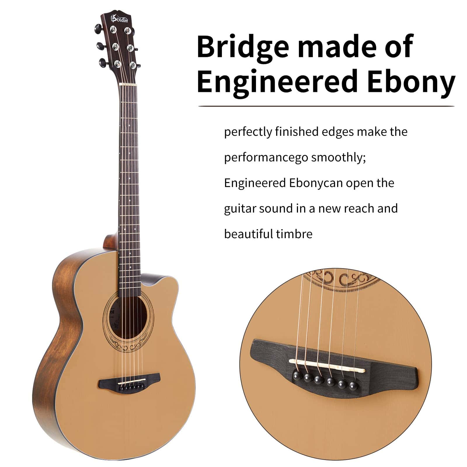 2. MANTÉNTE EN SINTONÍA – Construido con cuerdas de bronce fosforado con núcleo hexagonal de acero de alto carbono y selleta de puente de alta dureza y cejuela de hueso, la guitarra Soldin es fácil de afinar y mantiene la afinación después del primer ajuste de cuerdas.