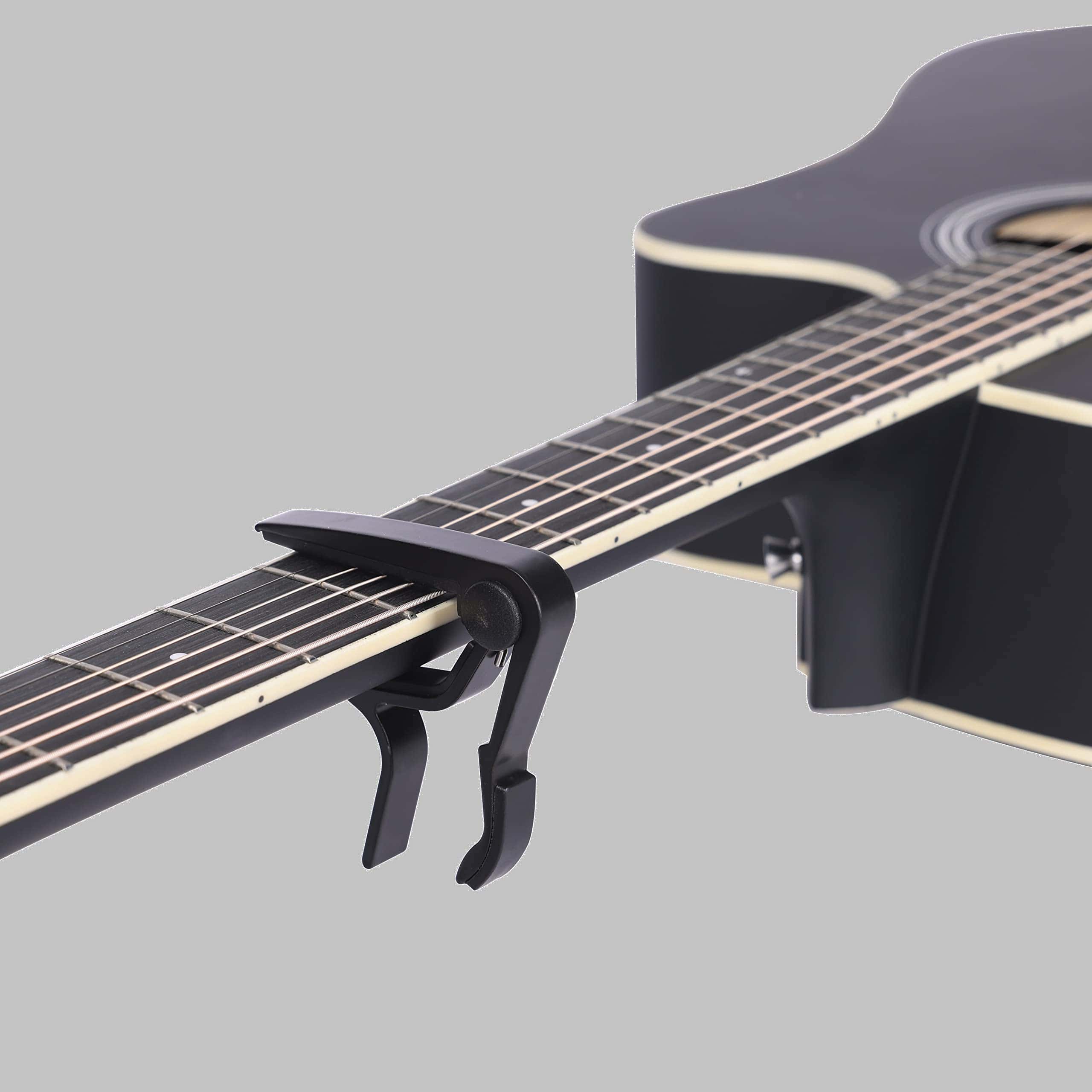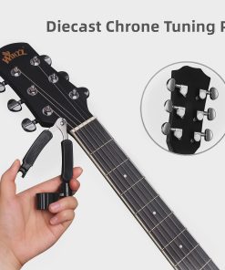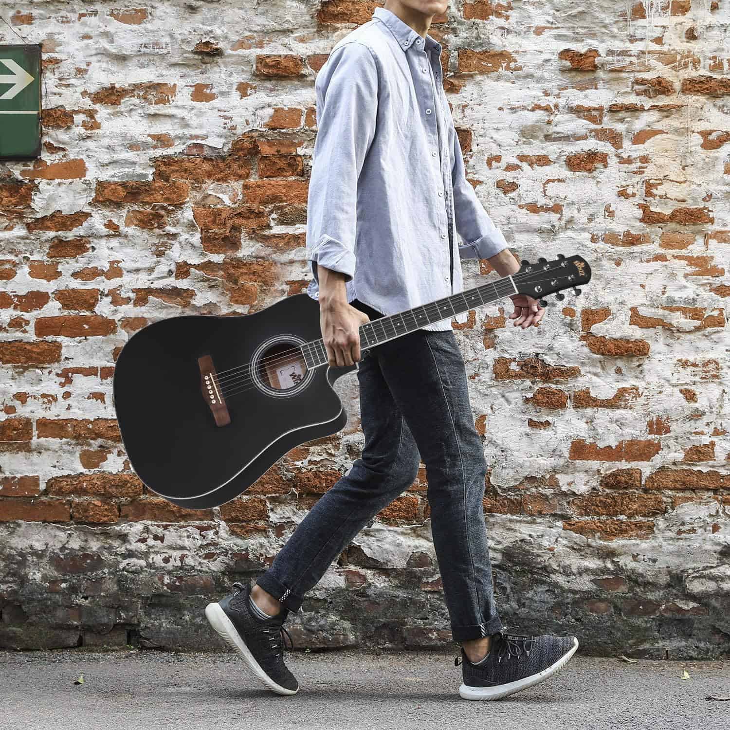 Guitarra acústica de tamaño completo con cutaway, ideal para principiantes. Cuenta con tapa de abeto, estructura en X, diapasón y puente de madera de alta densidad para un tono equilibrado. Cuerpo con acabado natural, líneas suaves y decorativas en la tapa, espalda y diapasón. Incluye kit de inicio con lecciones en línea, estuche acolchado impermeable, soporte de pared, cejilla, juego de cuerdas extra, afinador electrónico, correa ajustable, 4 púas y paño para limpieza.