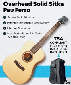 LA GUITARRA DE VIAJE DEFINITIVA: Nunca más te verás obligado a revisar tu guitarra o dejarla atrás porque es demasiado larga para caber en el coche. La guitarra de viaje Overhead utiliza un sistema de cuello plegable patentado que permite el ensamblaje/desmontaje en cuestión de segundos. Después de empacarla en su mochila de viaje, la guitarra de viaje Overhead se puede llevar a la mayoría de las principales aerolíneas, cabiendo fácilmente en el compartimento de arriba. LOS DETALLES: La OF422 Overhead, nuestra guitarra acústica de viaje plegable, cuenta con una tapa de Sitka sólida, un fondo de Pau Ferro sólido y se descompone en los requisitos de tamaño de equipaje de mano de las aerolíneas (22x14x9 pulgadas). ¡Se ensambla en 20 segundos con nuestro sistema de cuello desmontable patentado garantizado de por vida! LOS EXTRAS: Pastilla tri-piezo y una mochila de viaje completa que cumple con las normas de la TSA incluidos. Una escala completa de 24.5 pulgadas, afinadores Journey 18:1, componentes de primer nivel y un diseño ergonómico en ángulo hacen de esta una de las guitarras más agradables que jamás tocarás!