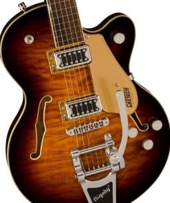Viva y fuerte, las guitarras Electromatic Center Block Junior están diseñadas para ese sonido puro y poderoso de Gretsch a alto volumen. La guitarra Gretsch G5655TQM Electromatic Center Block Junior Single-Cut con Bigsby presenta un cuerpo de tamaño compacto con una impresionante tapa, dorso y costados de arce acolchado y un bloque central de abeto ahuecado para resonancia dinámica, potencia de alto rendimiento y comodidad ligera. Un mástil de arce más bajo ofrece acceso y rendimiento sin esfuerzo, mientras que el diapasón de laurel de radio 12 pulgadas con 22 trastes medium jumbo y marcadores de posición Neo-Classic ofrece una excelente tocabilidad. Esta es una guitarra diestra de 6 cuerdas disponible en acabado Sweet Tea. Pastillas Audaces Sus dos pastillas humbucking Broad’Tron Black Top ofrecen un tono audaz, dinámico y articulado con mayor pegada sonora. La combinación de controles individuales de volumen de pastilla, tono principal y volumen principal con circuito de retención agudos te permite aprovechar el poder sonoro de este instrumento. Estilo Icónico Elaboradas meticulosamente con el sonido, estilo y tocabilidad Gretsch esenciales, estos modelos completamente nuevos ofrecen la autenticidad intrépida y electrizante que ha distinguido a Gretsch durante décadas. Es el sonido de la propia honorabilidad.