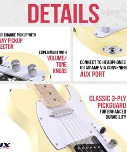 Toda la viveza de la legendaria guitarra eléctrica vintage. Transporte a una era pasada de la realeza del rock con esta impresionante guitarra LyxPro 30. Con todas las cualidades tradicionales del amado estilo original, este modelo popular es querido por principiantes, intermedios y avanzados jugadores de todo el mundo. Con su sólido cuerpo de madera de Paulownia, cómodo mástil de arce en forma de C, puente de estilo vintage y otros acentos retro, este impresionante instrumento combina estilo clásico con calidad de sonido LyxPro inigualable. Un diapasón hecho a mano hace que el picking sea un placer, mientras que un avanzado interruptor de 3 vías, perillas de tono y volumen permiten una entonación y control de audio sin problemas. ¡Simplemente enchúfelo, tome una de las dos púas incluidas y descubra la diferencia LyxPro! ¡Agregue una guitarra eléctrica de 30» a su carrito hoy mismo! Lo que se incluye: 1 x Guitarra eléctrica de 30», 2 x Púas para guitarra, Guía del usuario. Especificaciones y detalles: Cuerpo: Single cut, Paulownia, Mástil: Forma en C, Arce, Afinadores: Clavijas de engranajes sellados, Trastes: 22, Puente: 3-saddle, tipo cenicero, Pastilla: Selector de 3 vías, Puerto AUX: sí.