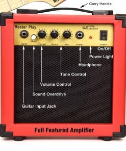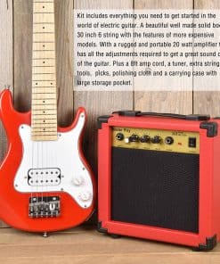 La Guitarra Eléctrica Master Play de 30 pulgadas es perfecta para niños y principiantes que desean aprender a tocar. Incluye un amplificador de 20 vatios, 6 cuerdas extra, púas, estuche para guitarra, correa para hombro, afinador digital, cable y paño de limpieza. ¡Empieza a tocar ya con este kit completo en color rojo!