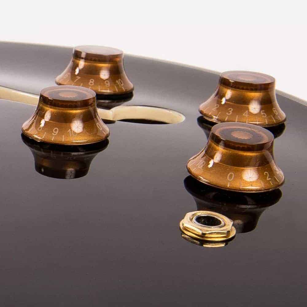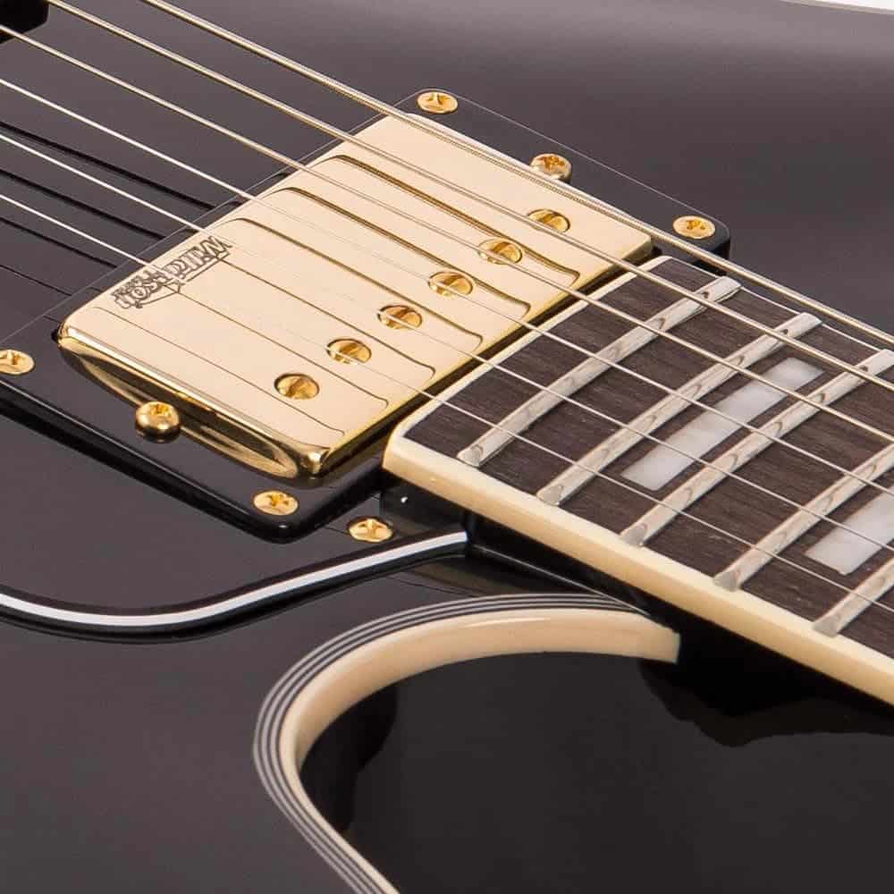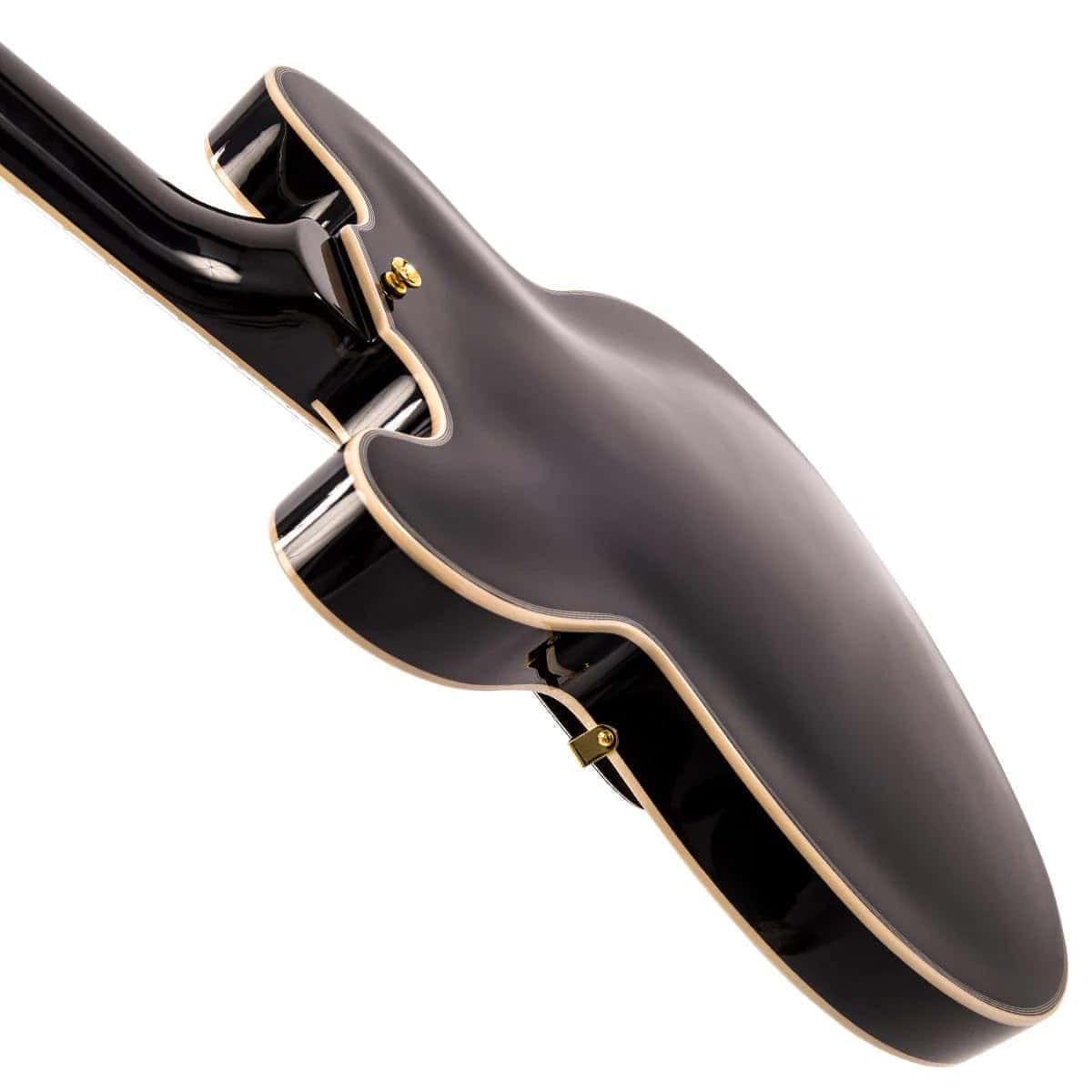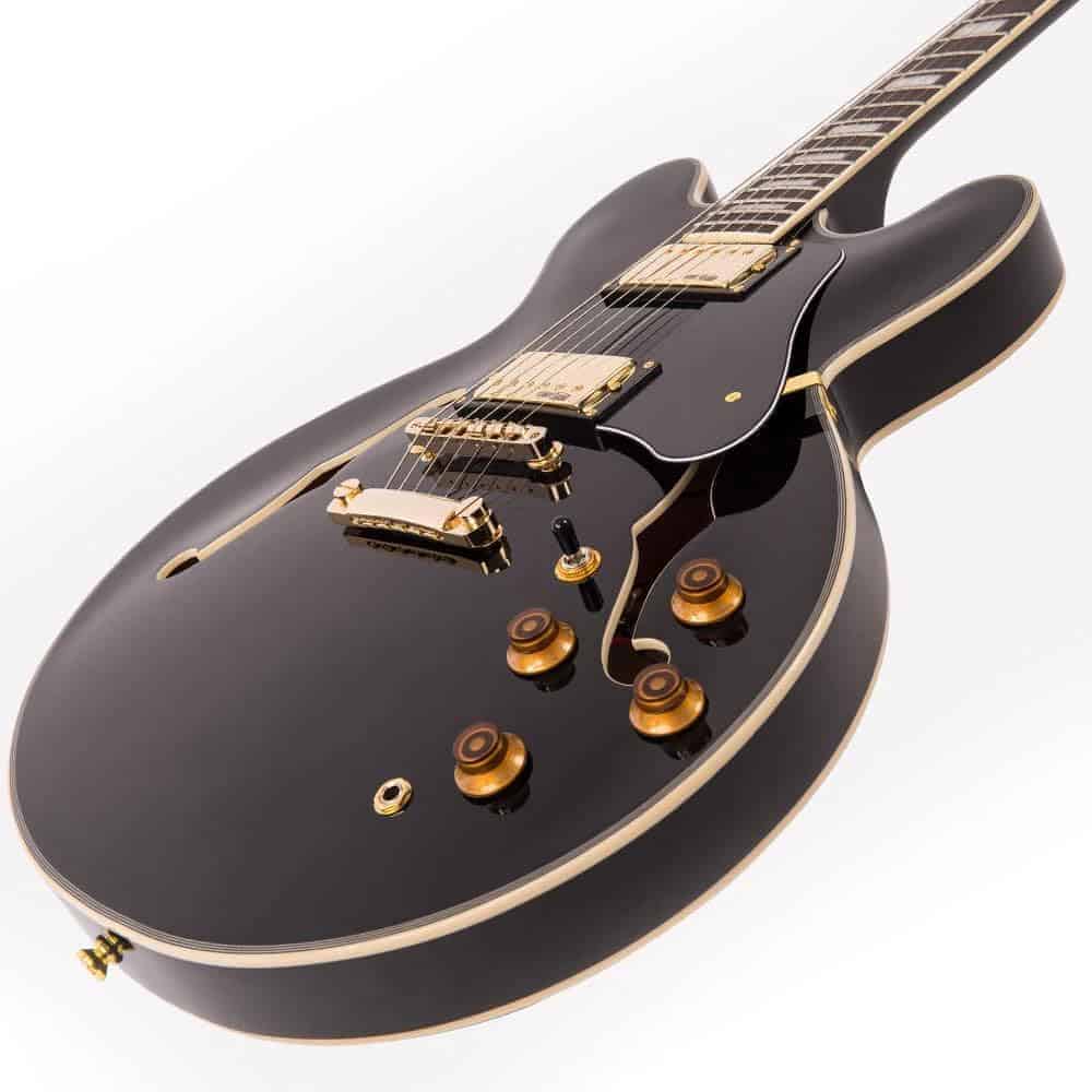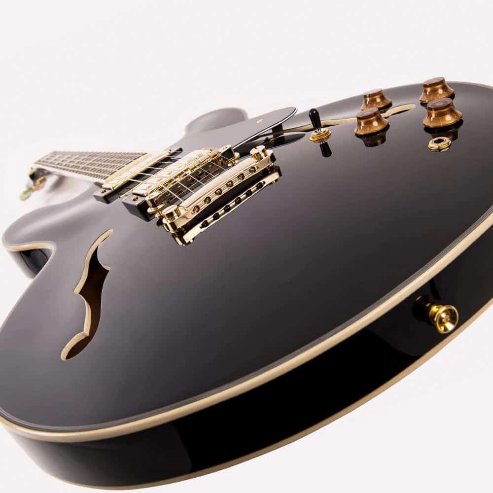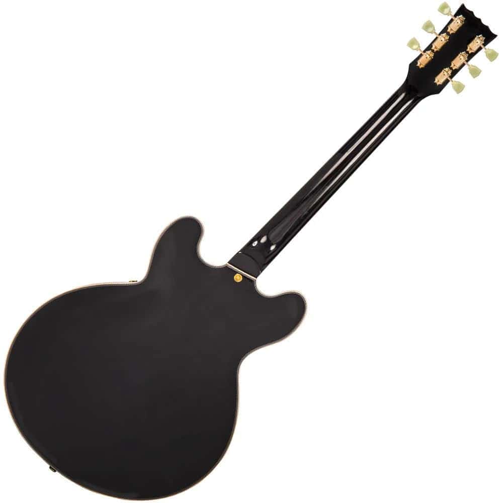 Guitarra eléctrica Vintage Reissue Series, Semi Hollow VSA500GBK en color negro. Especificaciones: Cuerpo: Arce con tapa de arce. Golpeador: Negro. Cuello: Caoba con cuello Set. Radio del diapasón: 12. Escala: 24.75 / 628mm. Trastes: 22. Incrustaciones del mástil: Punto perlado. Puente: Tune-O-Matic con cordal Stop Bar. Pastillas: 2 Wilkinson WOCHB. Controles: 2 de Volumen/ 2 de Tono/ Interruptor de 3 posiciones. Hardware: Dorado.