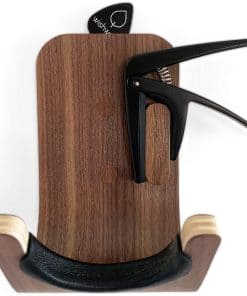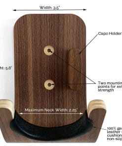Un colgador de guitarra de diseño moderno bellamente elaborado con almacenamiento integrado para púas y soporte para capo. Una forma creativa y funcional de almacenar y exhibir tus guitarras o instrumentos musicales preciosos. Con materiales de calidad y la seguridad de tus instrumentos como prioridad, los colgadores de guitarra de madera de Wishwood Music están hechos para resistencia a partir de cinco capas de madera contrachapada doblada, chapa de madera auténtica de nogal y cuero negro suave 100% natural. Hemos investigado y probado los mejores sistemas de montaje para garantizar una completa estabilidad en la pared, por lo que incluimos 2 tornillos de acero inoxidable de 1.5″ y 2 anclajes huecos con una capacidad de peso de 100 lb con cada gancho para que tengas todo el hardware y accesorios necesarios para todo tipo de paredes, lo que facilita que el soporte de guitarra se monte fácilmente en cuestión de minutos. Instalar el colgador de guitarra en tu pared es rápido y sencillo, solo necesitas un destornillador o taladro para completarlo. EL PAQUETE INDIVIDUAL CONTIENE: 1 x Colgadores de Madera de Nogal y Cuero Negro con Soportes para Capo; 2 x Tornillos de Fijación y Anclajes para Montaje en Pared de Alta Resistencia; 2 x «stickers» de color nogal; 2 x Púas de Guitarra Wishwood Music; 1 x Caja de Regalo Nota: ¡Capos NO incluidos! Nuestros colgadores se pueden utilizar como un rack montado en la pared para cualquier instrumento de cabeza simétrica, incluyendo guitarras acústicas, ukelele, bajo, cello, mandolina e incluso monopatines!
