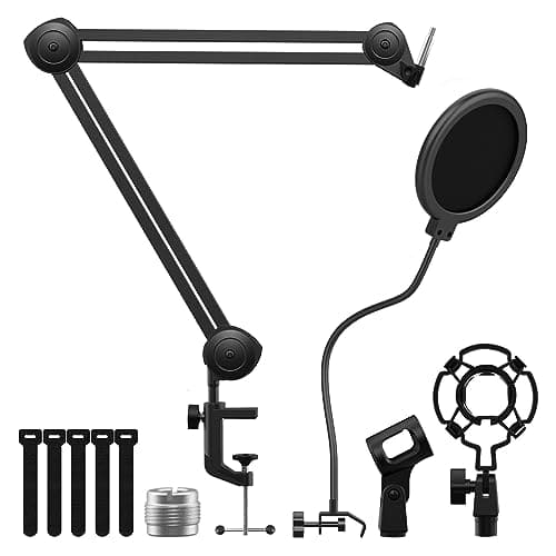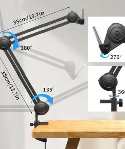 4. Tres etapas de ángulo flexible – Brazo plegable ajustable completo, flexible y cambiante. La rotación libre en cuatro ejes. El soporte de brazo de micrófono tiene un scrambler y viene con una abrazadera en C fuerte para una sujeción firme a su escritorio, lo que lo hace ideal para podcasts, transmisiones de radio y estudios de grabación en casa.