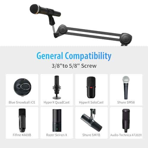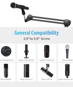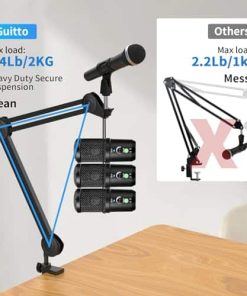2. Amplia compatibilidad – Adaptador de tornillo universal de metal de cabeza de 5/8″ a 3/8″ + pinza de micrófono + suspensión de micrófono. El soporte de brazo de micrófono GUITTO GMS-02 cuenta con una suspensión de micrófono que es compatible con la mayoría de micrófonos estándar y soporta una capacidad de peso de hasta 2 kg, lo que lo convierte en un accesorio esencial para cualquier creador de contenido.
