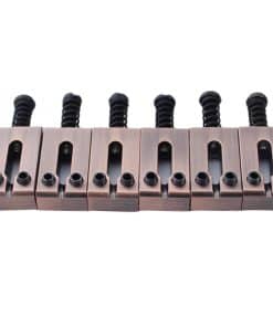 Las silletas de latón proporcionan una mejor entonación y sujetan tus cuerdas firmemente. Es una buena opción para actualizar tu puente de tremolo existente para más sustentación, una sensación más suave al tocar y un aspecto más moderno. Mantiene las cuerdas afinadas. También evita que las cuerdas se rompan. Silletas de metal de repuesto para puentes de tremolo o fijos de Strat. Se ajustan para reemplazar silletas rotas o perdidas en tu estilo vintage, o puente de tremolo Strat ST Tele TL. Mejorando el tono y la sustentación y manteniendo tu guitarra afinada, silletas de repuesto para puentes de tremolo o fijos de Strat, buena elección para reemplazar las silletas de tu guitarra o actualizar el puente. Gran accesorio de guitarra eléctrica y reemplazo para amantes de la guitarra, fácil de instalar y usar. Trabajo delicado de pulido en bronce/plata antigua, superficie lisa para que uses. Silletas de latón sólido; aumentarán la sustentación y la estabilidad de la afinación. Especificaciones: Espaciado de cuerdas: 10.8mm (0.43 pulgadas) / 10.5mm (0.41 pulgadas) Material: Silleta de latón Forma disponible: Tipo rectángulo 3 colores disponibles: negro, bronce, plata antigua 2 estilos de silleta: silleta de rueda o silleta ordinaria se pueden elegir Incluye: Juego de 6 silletas de puente de tremolo