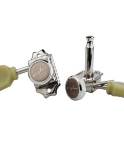 Guyker 3×3 Vintage Style Locking Guitar Machine Heads � 1:15 Ratio Lock String Deluxe Tuning Key Pegs Tuners Set es un conjunto de 6 clavijas de bloqueo para guitarra (3 para diestros, 3 para zurdos), 12 tornillos de montaje y 6 casquillos roscados, ideal como reemplazo para guitarras eléctricas o acústicas de estilo LP, SG, TL. Estas clavijas selladas para guitarra cuentan con engranajes internos de alta resistencia, robustas y convenientes. Fáciles de instalar y reemplazar. Las clavijas de bloqueo de Guyker ayudan a proporcionar una afinación más fina y una mayor estabilidad. Botón verde en forma de tulipán con carcasa sellada. Niquelado. Relación de engranajes – 1:15, diseñado para adaptarse a agujeros modernos de 9 mm en la pala de la guitarra. Por favor, revise el dibujo de los parámetros en las imágenes adjuntas antes de realizar su pedido.