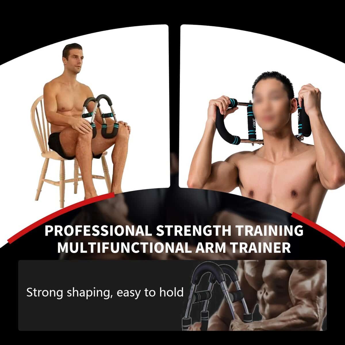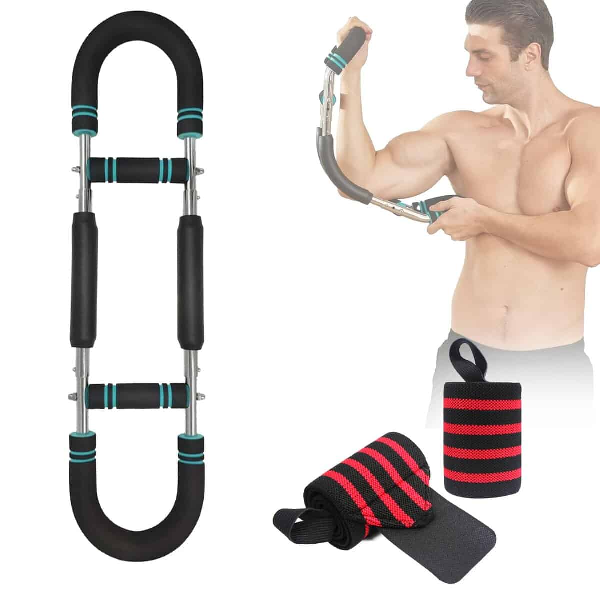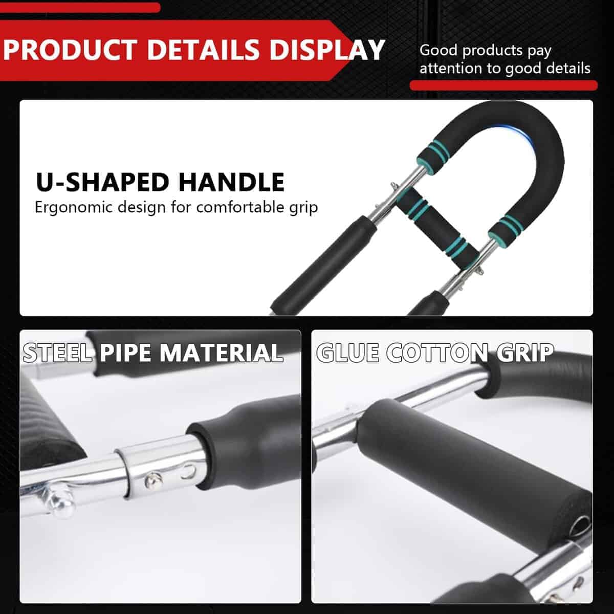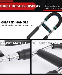 1. Materiales utilizados: El entrenador de brazos está hecho de tubo de acero. El material de tubo de acero es resistente y duradero, y está equipado con una funda de algodón de goma, que se ajusta al tubo de acero de forma más cómoda.