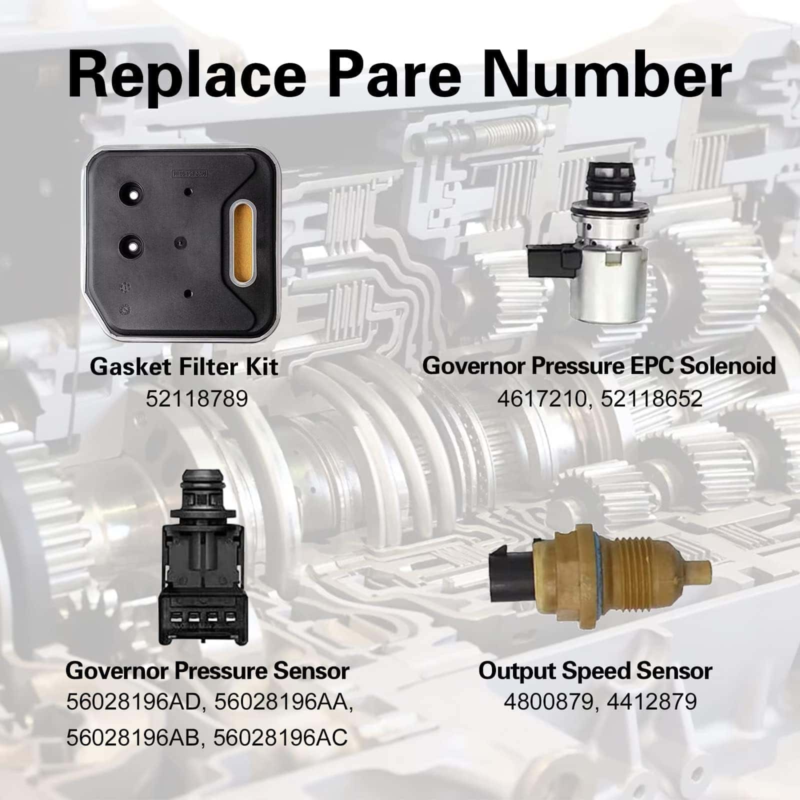 Este kit viene con todas las piezas que necesitas para cambiar el sensor de presión del regulador y solenoide de presión del regulador & Sensor de velocidad de salida Compatible con transmisión Dodge, Compatible con Chrysler Compatible con Jeep. ¡Incluye juntas nuevas para hacer el trabajo correctamente! Solo se utilizan las piezas de la más alta calidad en nuestros kits y cumplen o superan las partes de OE. Ajuste Compatible con Dodge 2000-2006 Ram 15002000-2007 Ram 25002000-2006 Ram 35002000-2003 Dakota2000-2003 Durango2000-2004 Grand Cherokee. Piezas incluidas en este kit: 1PCS Solenoide de Presión del Regulador de Alta Resistencia (Borg-Warner O.E 4617210/ 52118652) 1PCS Sensor/Transductor de Presión del Regulador (O.E. 56028196AD 56028196AA / 56028196AB / 56028196AC) 1PCS Sensor de Velocidad de Salida (O.E. 4800879 / 4412879) 1PCS Filtro de Aceite de Transmisión (O.E 52118789) 1PCS Junta de Cárter de Aceite de Corcho & Caucho Actualizada (O.E 2464324) 1PCS Junta del Bloque de Alojamiento del Solenoide del Regulador (O.E 4886333AA)
