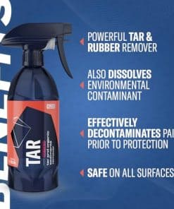 El alquitrán y el asfalto son muy dañinos para tu auto y generalmente son muy difíciles de eliminar. Gyeon Tar hace un trabajo fácil al disolver de manera segura estos contaminantes y facilita la eliminación de materia orgánica, como la savia de los árboles y otras contaminaciones ambientales. CÓMO USARLO: lava todo el auto con un champú de alta calidad para autos, enjuaga bien y rocía generosamente Q2m Tar, espera de 2 a 4 minutos para que el alquitrán haga efecto y enjuaga o limpia con un paño de microfibra húmedo hasta que la superficie quede perfectamente lisa. Evita aplicar a la luz directa del sol.