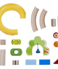 Contenidos: 1 arco con pequeña campana, 1 curva empinada, 5 curvas, 1 pista recta, 8 elementos conectores, 1 bloque de inicio, 2 columnas, 3 bloques de dominó, 2 bloques de escalera, 1 bola Paul, 1 bola.