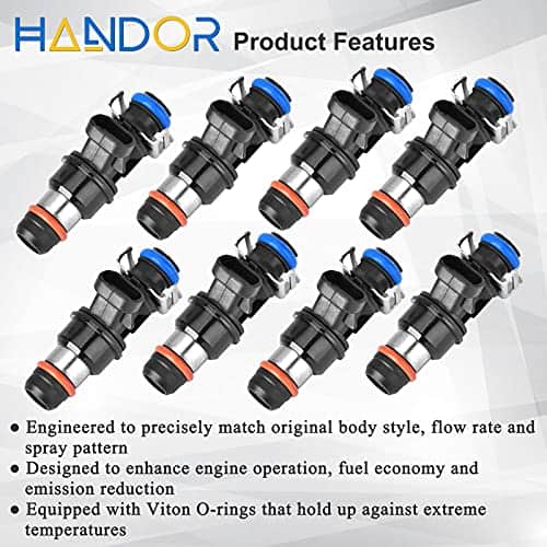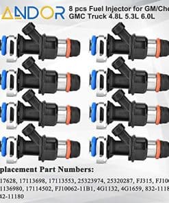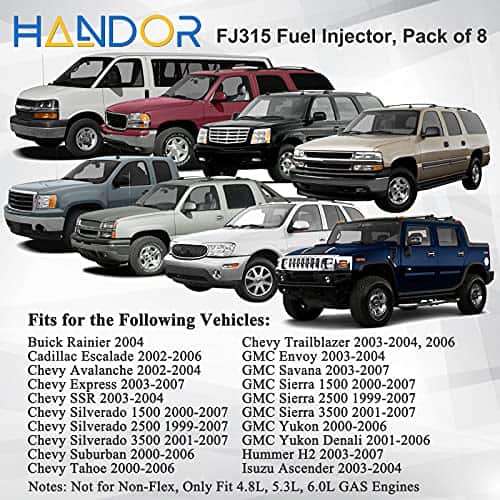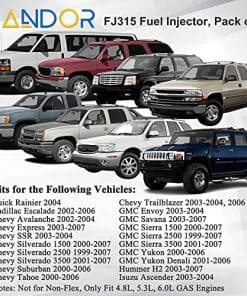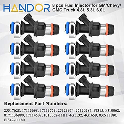 Handor inyectores de combustible te ayudan a lograr la máxima eficiencia de combustible y potencia de tu motor. Los inyectores en funcionamiento adecuado son componentes esenciales para permitir que tu vehículo funcione perfectamente. Estas piezas de repuesto de calidad están disponibles para cientos de aplicaciones específicas. No conduzcas con una entrega de combustible defectuosa. Actualiza los inyectores de combustible desgastados o con mal funcionamiento con modelos confiables de nuestra marca. Ajustable para Rainier 2004, Escalade 2002-2006, Chevy Avalanche 2002-2004, Chevy Express 2003-2007, Chevy SSR 2003-2004, Chevy Silverado 1500 2000-2007, Chevy Silverado 2500 1999-2007, Chevy Silverado 3500 2001-2007, Chevy Suburban 2000-2006, Chevy Tahoe 2000-2006, Chevy Trailblazer 2003-2004, 2006, GMC Envoy 2003-2004, GMC Savana 2003-2007, GMC Sierra 1500 2000-2007, GMC Sierra 2500 1999-2007, GMC Sierra 3500 2001-2007. Ajustable para GMC Yukon 2000-2006, GMC Yukon Denali 2001-2006, H2 2003-2007; Isuzu Ascender 2003-2004; Solo es compatible con motores de GAS 4.8L, 5.3L, 6.0L. Números de pieza de referencia de cruces/reemplazo para: 5317628, 17113698, 17113553, 25323974, 25320287, FJ315, FJ10062, 8171136980, 17114502, FJ10062-11B1, 4G1132, 4G1659, 832-11180, FI842-11180. NOTAS: Este paquete incluye 8 piezas de inyectores de combustible. Cuando los inyectores están defectuosos, con mal funcionamiento, sucios, obstruidos o con fugas, causarán problemas de arranque del motor, ralentí, ralentí, falla de emisiones, rendimiento deficiente, el motor no alcanza las RPM completas, aumento del consumo de combustible y un rendimiento de motor deficiente. Varios metros de tracción y flexión bajo acelerador, humo de escape, golpe de motor o explosión, que pueden causar fallos catastróficos del motor y contaminación. Recomendamos limpiar los inyectores de combustible al menos cada 36 meses o 45,000 millas para evitar el costo y la molestia, dependiendo del tipo de conducción que hagas. Diseñados como un reemplazo directo de tu pieza desgastada o con mal funcionamiento, los inyectores de combustible de Handor proporcionarán una instalación fácil y sin complicaciones y ayudarán a restaurar la funcionalidad del sistema de combustible necesario para mantener tu vehículo funcionando de manera confiable, eficiente y segura durante muchos kilómetros por venir.