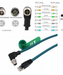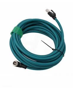 1. Cable de red Ethernet M12 X-coded de 8 pines macho con ángulo recto a conector RJ45 para Cognex DataMan 260 280 380 370 470 580 reader / In-Sight 2800 3800 2000 9000 8000, 7000 Gen2 vision sensor, 3D-L4000 D900. 5 metros / 16.4 pies. Número de parte CCB-84901-2002-xx. 2. Cable Ethernet M12 para el sensor de visión de procesamiento de imágenes de Basler Baumer, para el sensor Keyence IV3 / lector de códigos de barras SR-5000, para el lector de matriz Datalogic 220 320, para la cámara Microscan HAWK MV-4000, para la red de sensores SICK gigabit, para Triton, y más sistema de visión de máquinas para aplicaciones de comunicación en red como la PC, computadora host, router PLC switches. 3. El cable M12 se utiliza ampliamente en sensor, sistema de cámara de sensor de imagen de visión de máquina, lector de códigos de barras, actuador, codificador, Ethernet industrial, red, pantalla LED exterior, control de automatización industrial, servomotor, robot, bus de campo, EtherNet/IP, profinet, EtherCAT, conmutadores, router, PC, host de computadoras, PLC, control de proceso, inyector PoE de energía. Estandar EIA/TIA 568B. 4. El cable puede evitar eficazmente señales de interferencia electromagnética, y puede transmitir datos a alta velocidad y estabilidad, hasta 10 Gbps. Cable con blindaje de malla de aluminio de múltiples capas, relleno de alambre de algodón, par trenzado 24AWG chaqueta de PVC azul oscuro. El cable es resistente a la abrasión, aceite, suciedad, oxidación, flexión, retardante de llama y puede ser utilizado en entornos industriales severos. 5. Características del conector: conexión sólida y suave. Conector roscado y blindado M12 con alivio de tensión para un uso estable y duradero en aplicaciones industriales severas. Contactos de cobre libres de oxígeno bañados en oro. Resistente a las vibraciones. La carcasa de metal (con blindaje) puede protegerse de la interferencia EMI / RFI en todas las direcciones y cumplir con el nivel IP67 de resistencia al polvo y al agua.