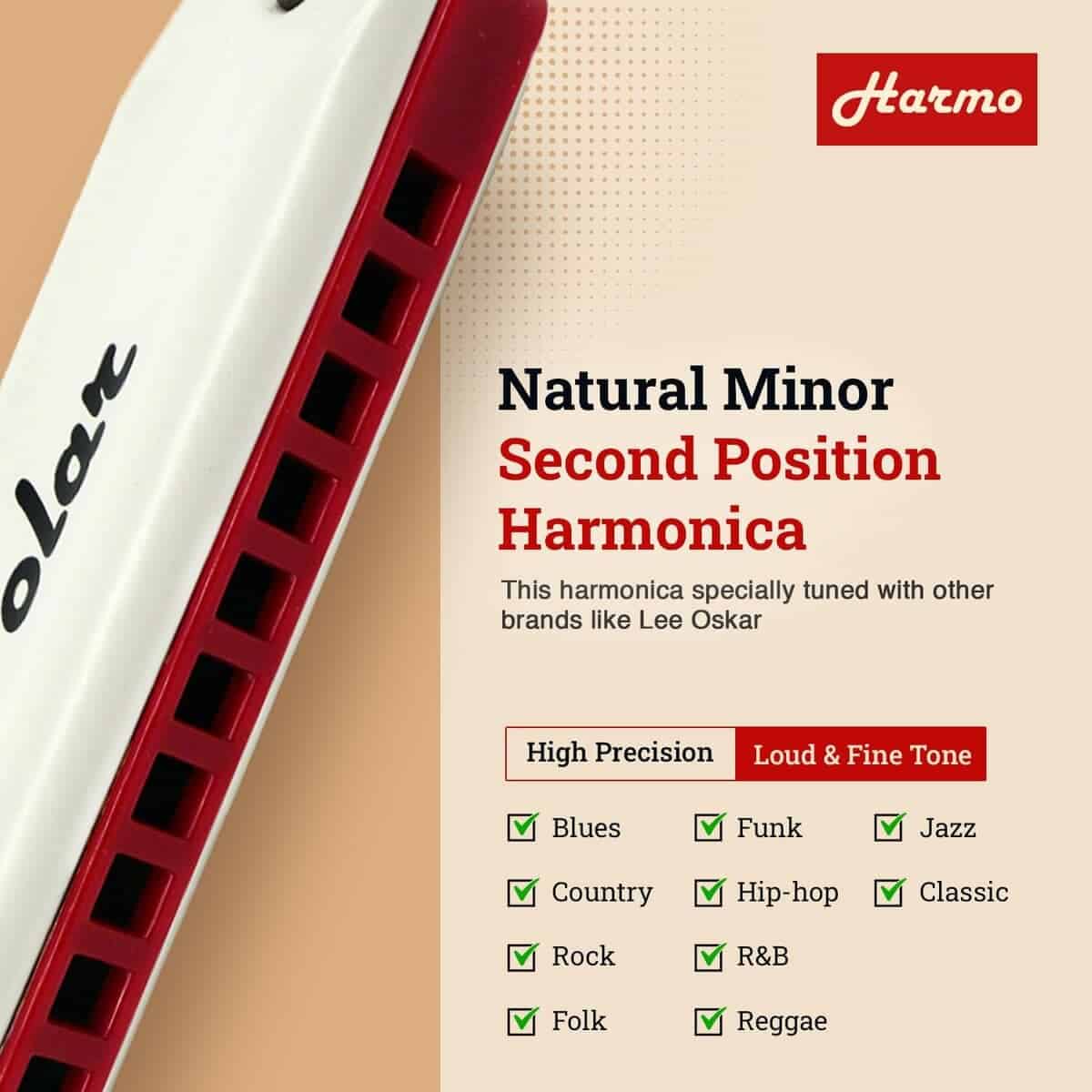 Armónica afinada en tonalidad natural menor : Esta armónica está afinada de manera especial (no afinación estándar richter) para facilitar que los principiantes y los jugadores intermedios toquen canciones menores en tonalidades de blues menores, pentatónicas menores naturales y modos dóricos. Si conoces patrones básicos mayores en la armónica afinada de manera estándar, puedes usar fácilmente una armónica afinada en tonalidad natural menor y reutilizar la mayoría de lo que ya sabes sin tener que aprender nuevos patrones y teoría compleja. En la tabla siguiente se puede ver un claro ejemplo de cómo la Harmo Armónica Polar afinada en tonalidad natural menor te ayuda a obtener las escalas menores más útiles con 0 a 1 doblado cuando necesitas entre 2 y 8 en una armónica estándar. Escala pentatónica menor de do en 2 octavas do natural menor re dorio do estándar 1 doblado + 1 sobre doblado 3 doblados + 3 sobredoblados 5 doblados + 3 sobredoblados do menor nat afinada 0 1 doblado 1 doblado Armónica Diatónica Polar por Harmo Asombrosa, Versátil, con Estilo. La armónica Polar utiliza un proceso específico interno que la hace especialmente bien ajustada para blues, folk, country, rock y funk, brindándote una gran proyección, estanqueidad y una buena configuración inicial amigable para overblows. Tonos completos y fuertes con respuesta rápida. Las cubiertas mates blancas de la Polar son una característica única que te hará destacar entre la multitud. Los bordes son muy suaves y adecuados para cualquier intérprete de armónica. La armónica Diatónica Polar por Harmo con afinación natural menor está disponible en todas las 12 tonalidades: do, do , re, re , mi, fa, fa , sol, sol , la, si bemoles y si. El paquete incluye: Un estuche con cremallera resistente mantiene el polvo fuera y permite que la humedad se evapore. Se incluye un paño limpiador Instrucciones básicas de juego