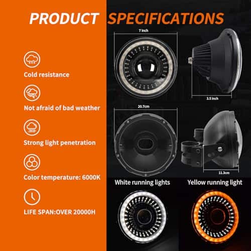 2. Puedes usar el DRL blanco como luz diurna, o usar el DRL ámbar. La tecnología LED proporciona una iluminación brillante y clara, súper brillante durante la noche, iluminando toda el área; El faro LED de 7 pulgadas ha mejorado significativamente tu experiencia de conducción y definitivamente verás mucho mejor por la noche.