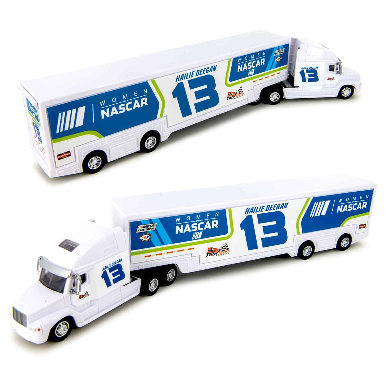 Esquema de pintura de las Mujeres en NASCAR de Hailie 2023. Precision-Engineered. Cuerpo de plástico, chasis y remolque de goma. Medidas aproximadamente 14″ x 2.5″ x 2″.