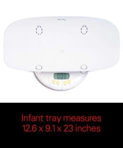 2. La bandeja para bebés está equipada con un seguro de seguridad para una mayor estabilidad durante el uso, mientras que la función de retención captura la medida de peso precisa de un bebé activo; Una vez que su bebé crezca fuera de la bandeja, la báscula se convierte en una báscula para niños pequeños con una capacidad de hasta 60 libras.