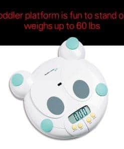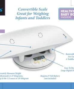 La Báscula de Oso de Peluche Health-o-Meter HDC100-01 ‘Grow with Me’ es una báscula para bebés y niños pequeños de consumo única en su tipo. A medida que su hijo crece, la báscula se convierte fácilmente de una bandeja a una plataforma, convirtiéndola en un dispositivo versátil y rentable para pesar a su hijo a medida que se desarrolla desde recién nacido hasta niño pequeño. Utilice la Báscula de Oso de Peluche para pesar a su bebé o niño pequeño. La pantalla LCD grande y fácil de leer de 1.2 pulgadas es orientada hacia adelante, por lo que leer el peso es muy sencillo. Además, para mayor precisión con niños pequeños, la báscula pesa en incrementos de medio libra hasta 60 libras. La calibración es sencilla con una característica de ‘anulación’ que le permite ajustar el peso de la ropa o un pañal. Esta báscula funciona con una batería de nueve voltios reemplazable (no incluida), incluye un gráfico de crecimiento para hacer un seguimiento de la altura y el peso en comparación con los promedios nacionales y está respaldado por una garantía limitada de cinco años. El paquete incluye la báscula para bebés y niños pequeños HDC100-01, un gráfico de crecimiento y garantía. La báscula para bebés y niños pequeños de Health o Meter 2 en 1 se convierte de estilo de bandeja de bebé a plataforma tradicional para adaptarse al crecimiento de su hijo. La forma de la báscula es la de un oso de peluche, lo que la hace amigable para niños de todas las edades. Incluye el Libro de Crecimiento Saludable que contiene gráficos de crecimiento para ayudarlo a monitorear y rastrear el peso y la altura de su hijo en comparación con los promedios nacionales.