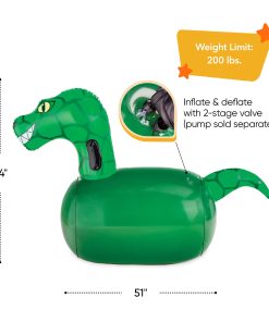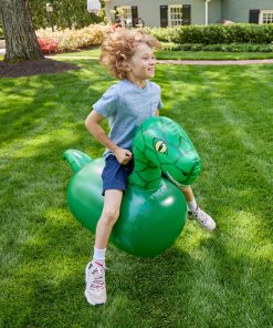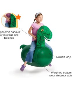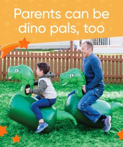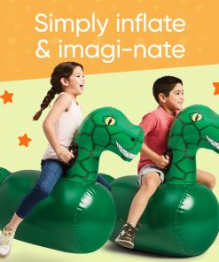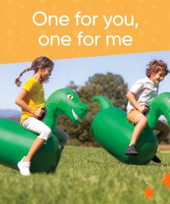 Una adición emocionante a nuestra familia favorita de juguetes saltarines inflables, prepárate para la diversión prehistórica con los Dinosaurios Inflables Hop ‘n Go. Vendidos como un set de 2, agarra a un amigo o hermano y salta, golpea y pisotea tu camino hacia la línea de meta con estos brillantes saltarines jurásicos verdes! Cada dinosaurio de vinilo duradero, con una amplia sonrisa, ofrece un paseo espacioso y viene equipado con asas resistentes en el cuello. El cuerpo grueso de PVC del dinosaurio resistirá una tarde de aventuras saltarinas, y los fondos están pesados con arena para mayor estabilidad. Perfecto para el juego activo, los niños pueden crear pistas para competir, o usar los simpáticos dinosaurios para crear historias fantásticas para juegos imaginativos. Los dinosaurios soportan hasta 200 lbs. Gran idea de juego activo y juego infantil para fiestas en el patio trasero y citas de juegos. Infla y desinfla rápida y fácilmente con la válvula de 2 etapas (bomba se vende por separado). ¡Incluidos dos kits de parches de reparación!